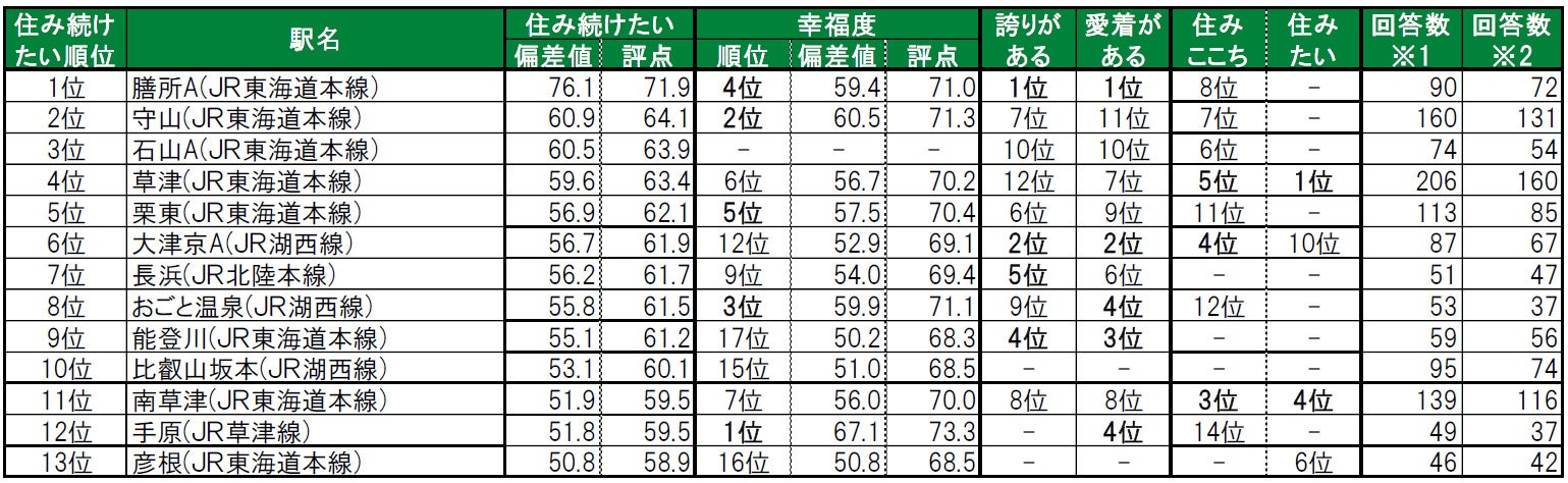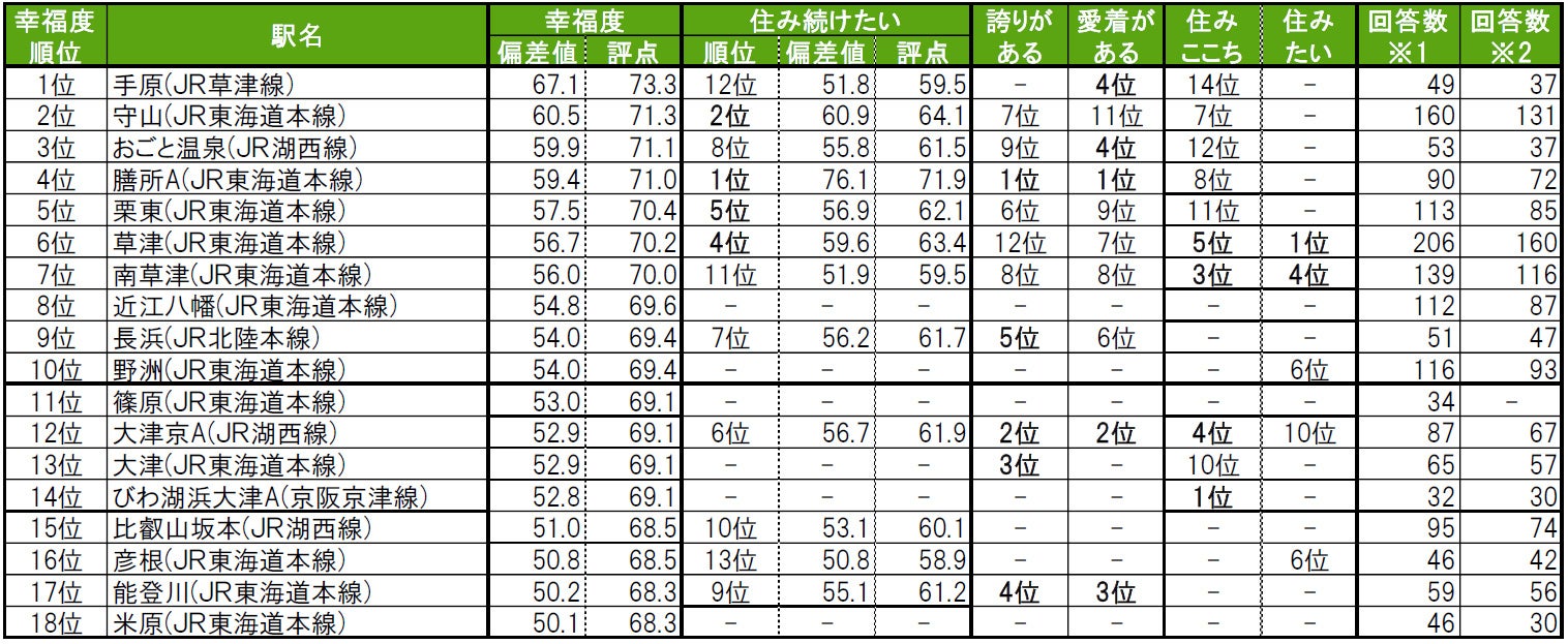 1位は2年連続で手原で、「街に愛着がある(駅)」では4位となっています。2位は守山で、「住み続けたい街(駅)」でも2位です。3位はおごと温泉で、「街に愛着がある(駅)」では手原と同率タイの4位となっています。