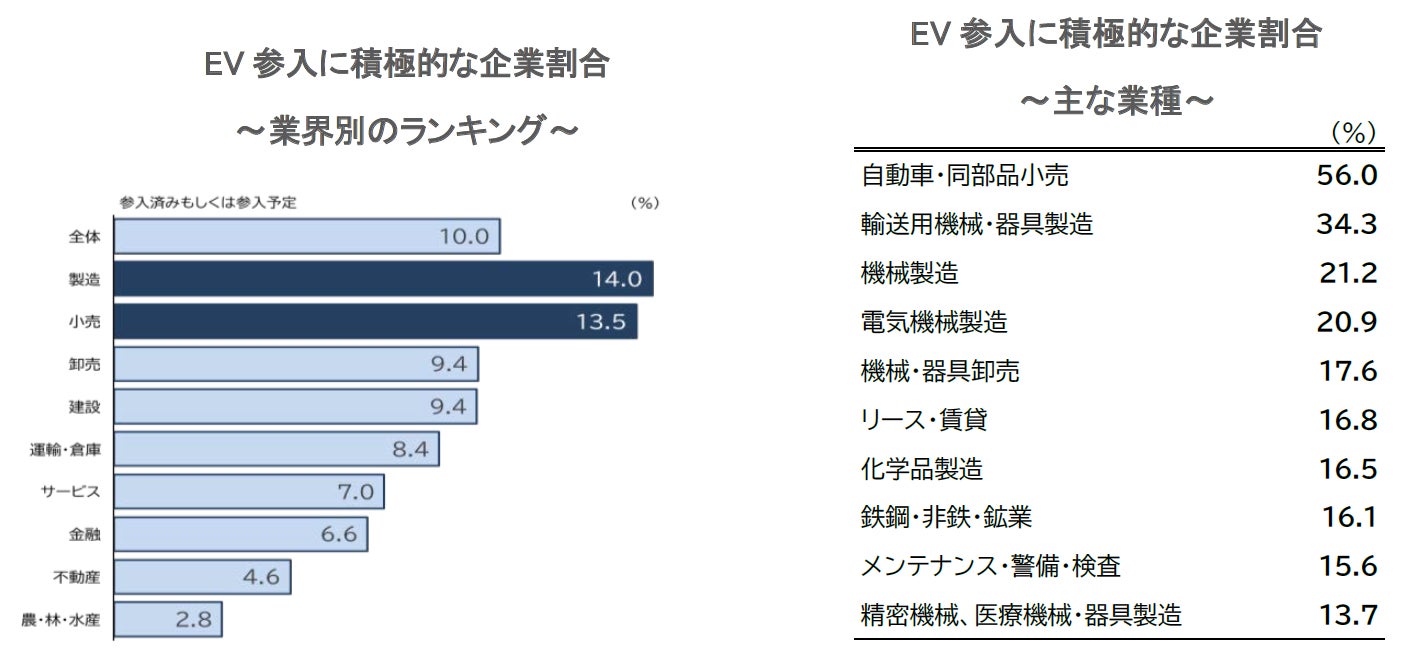 これを細かな業種でみると、第1位は「自動車・同部品小売」の56.0%。この業種に属する過半の企業が『参入済みもしくは参入予定』となった。第2位は自動車・自動車部品の「輸送用機械・器具製造」が34.3%で続いた。