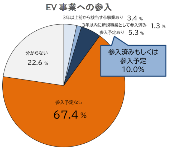 EV事業への参入については、「3年以上前から該当する事業あり」が3.4%、「3年以内に新規事業として参入済み」が1.3%、「参入予定あり」が5.3%となった。全体の1割が『参入済みもしくは参入予定』であり、何らかのかたちで拡大するEV市場に関わっていく意思を持っていることがわかった。