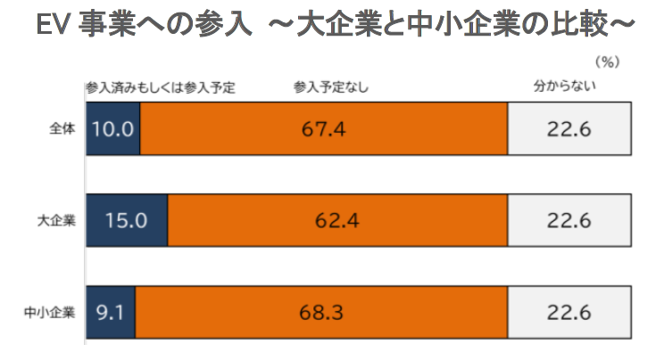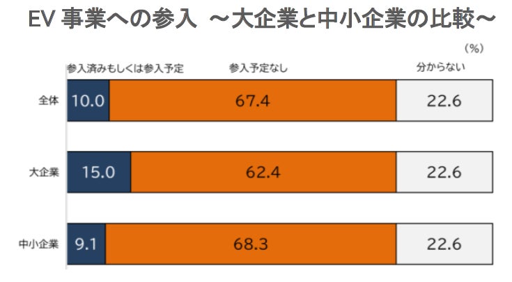 EV事業への参入について、規模別にみると、『参入済みもしくは参入予定』が「中小企業」では9.1%であるのに対し、「大企業」では15.0%となり、「中小企業」を5.9ポイント上回った。