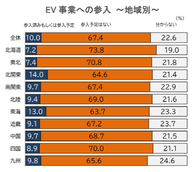 EV事業への参入を地域別にみると、『参入済みもしくは参入予定』が最も高いのは『北関東』の14.0%。