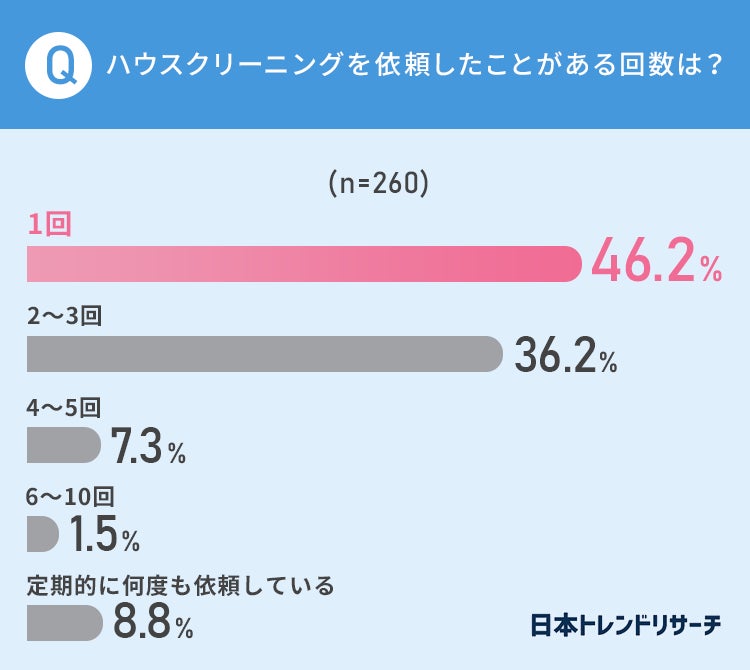 「1回」と回答した方が46.2%でもっとも多い結果になりましたが、一方で合わせて53.8%の方は2回以上依頼したことがあるようです。