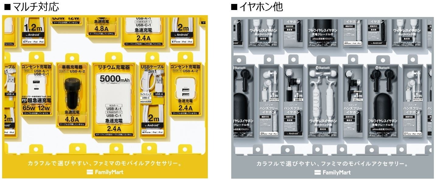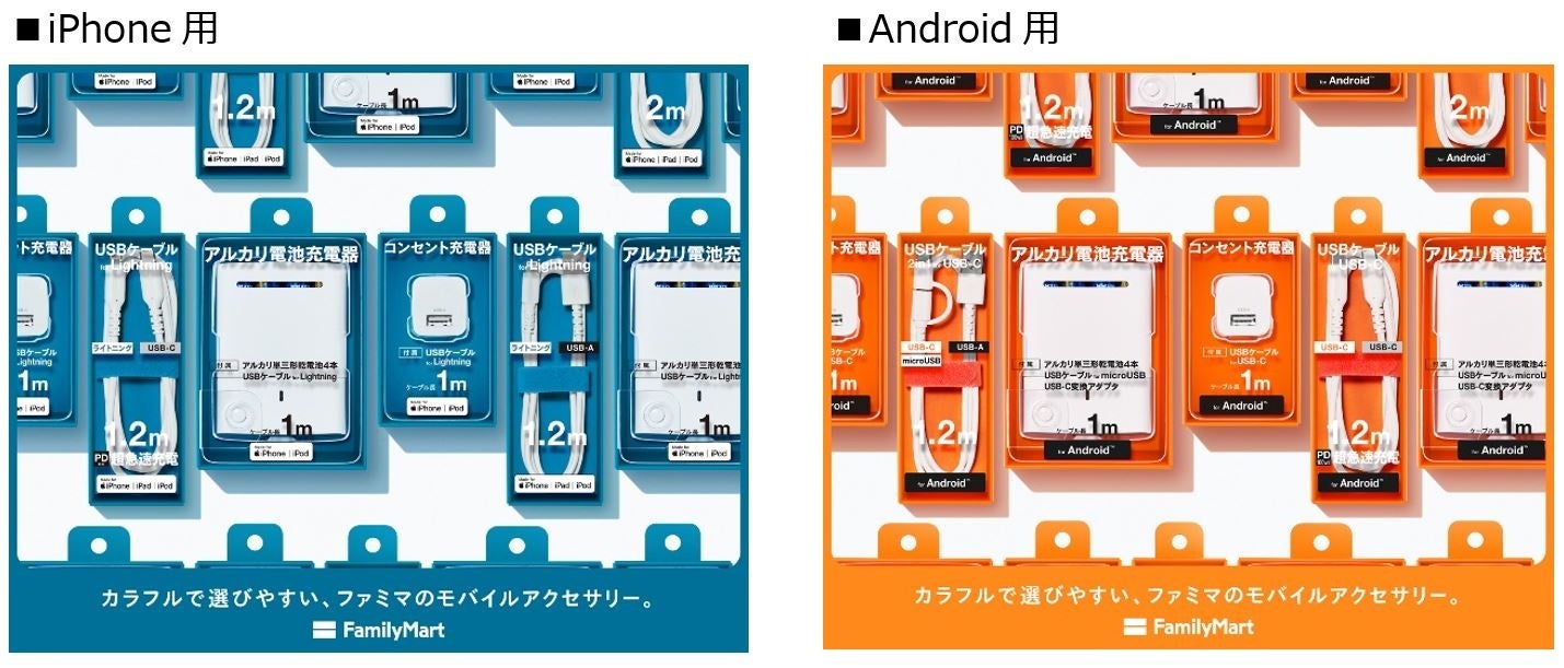 このたび、コンビニエンスウェアのデザイナーである落合宏理氏監修のもと、モバイルアクセサリーのパッケージデザインを一新いたします。使用用途ごとにUSBケーブルやコンセントのカラーリングを統一し、分かりやすさとデザイン性を両立した買いやすい売場に変更いたします。iPhone用を”ネイビー”、Android用を”オレンジ”、マルチ/充電器本体を”イエロー”、イヤホンを”シルバー”のカラーリングに統一されることに加え、落合宏理氏監修のファミリーマート限定カラー「クリアライム」のライトニングケーブルも発売いたします。