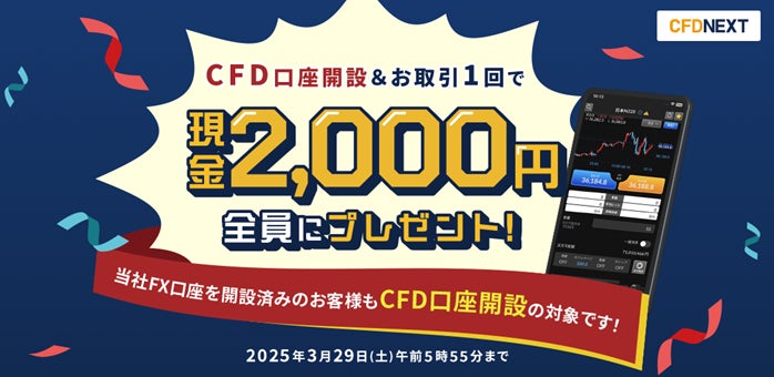 株式会社外為どっとコム(本社:東京都港区、代表取締役社長:竹内 淳)は、『CFDネクスト』におきまして、2025年2月24日(月)より「口座開設&お取引1回でもれなく現金2,000円をプレゼント!キャンペーン」を実施します。