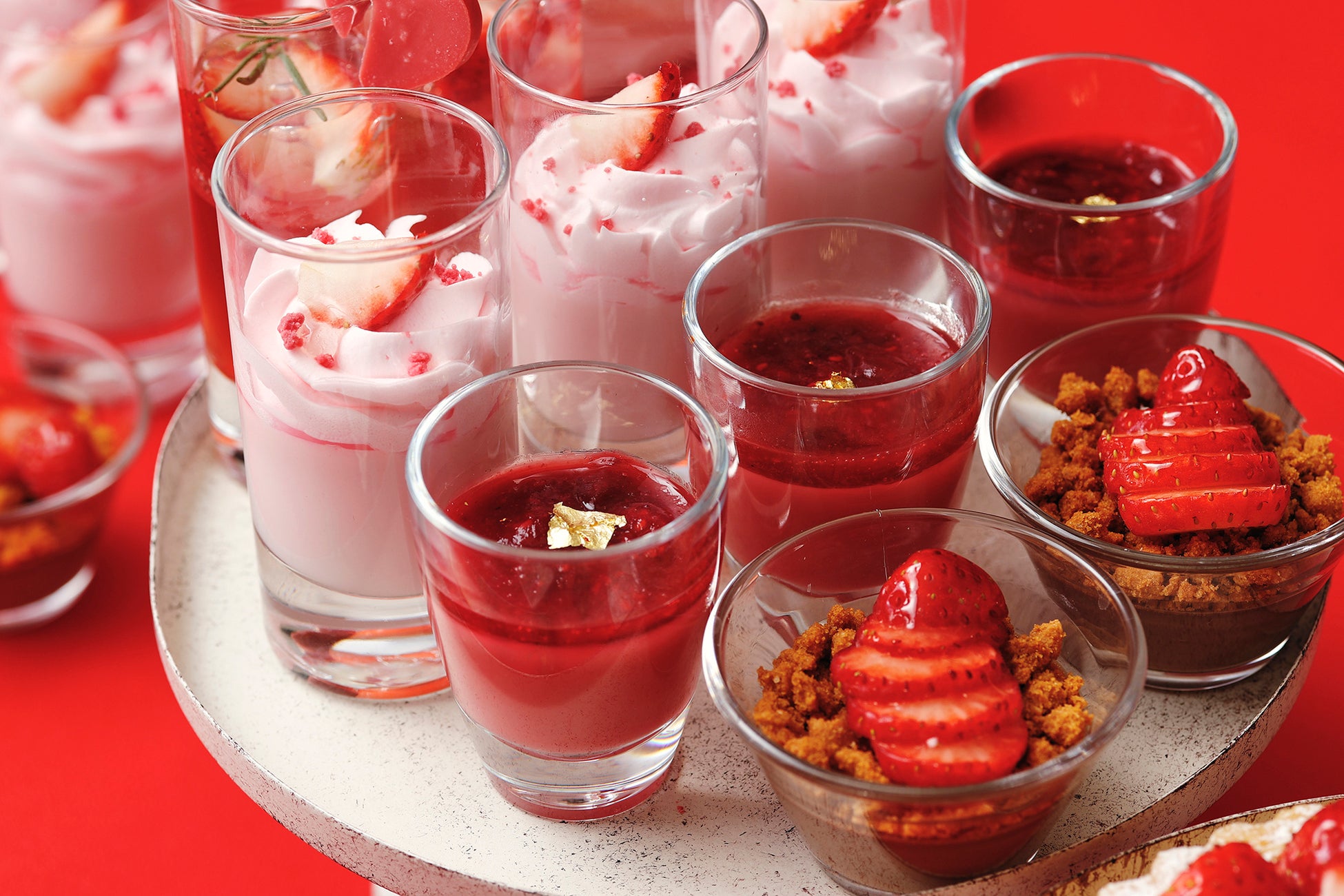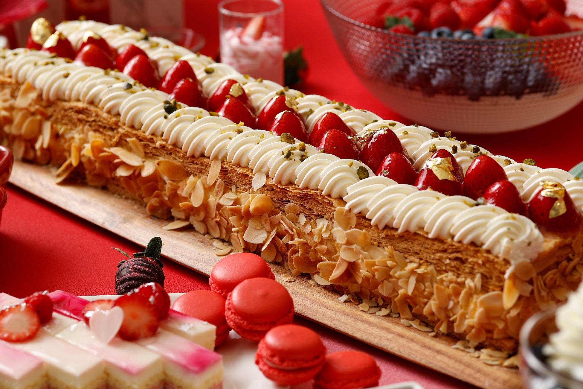 グラススイーツには、ルビーチョコレートといちごソースを合わせたベリーヌ、ライトピンクカラーのいちごのパンナコッタ、濃厚なチョコレートにザクザクのクランブルといちごをのせたプリンなどが登場。ガトーには、いちごを贅沢に敷き詰めたタルト、美しいピンクのグラサージュが目を惹くマスカルポーネフレーズ、いちごのクリームとハートモチーフのチョコレートでデコレーションされた濃厚なオペラ、ホワイトチョコレートといちごのブラウニーなどが並び、いちごとチョコレートのマリアージュを存分にご堪能いただけます。