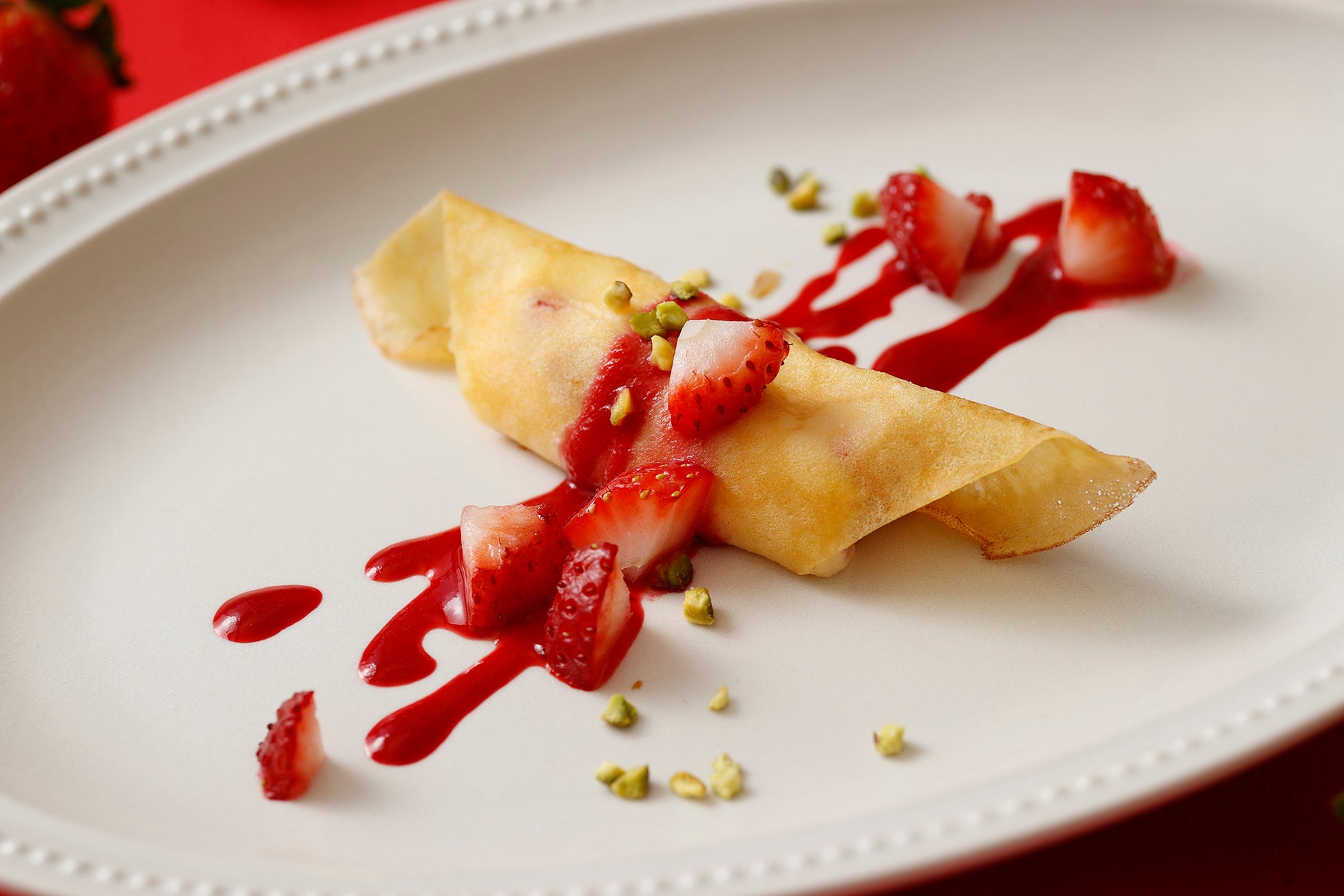 また、おもてなしのファーストディッシュとして、フレッシュいちごとカスタードクリームを包んだモチモチ食感のクレープをソース・ルージュとともにお席までご用意いたします。