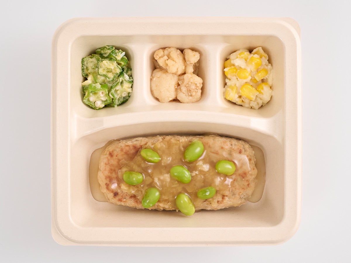 今回発売する「お豆腐仕立ての和風ハンバーグ」は、人気のハンバーグメニューに、毎日食べたくなるようなやさしさと満足感を兼ね備えた、和の一皿です。豆腐をメインに、鶏肉をバランスよく加えることで、ヘルシーでありながらしっかりと満足できるお豆腐ハンバーグを実現しました。ふんわりとした食感と程よい弾力でお箸でも食べやすく、お子さまからご年配の方まで幅広くお楽しみいただけます。トッピングの枝豆とキャベツの食感がアクセントになり、お出汁が香る和のソースが食欲をそそります。
