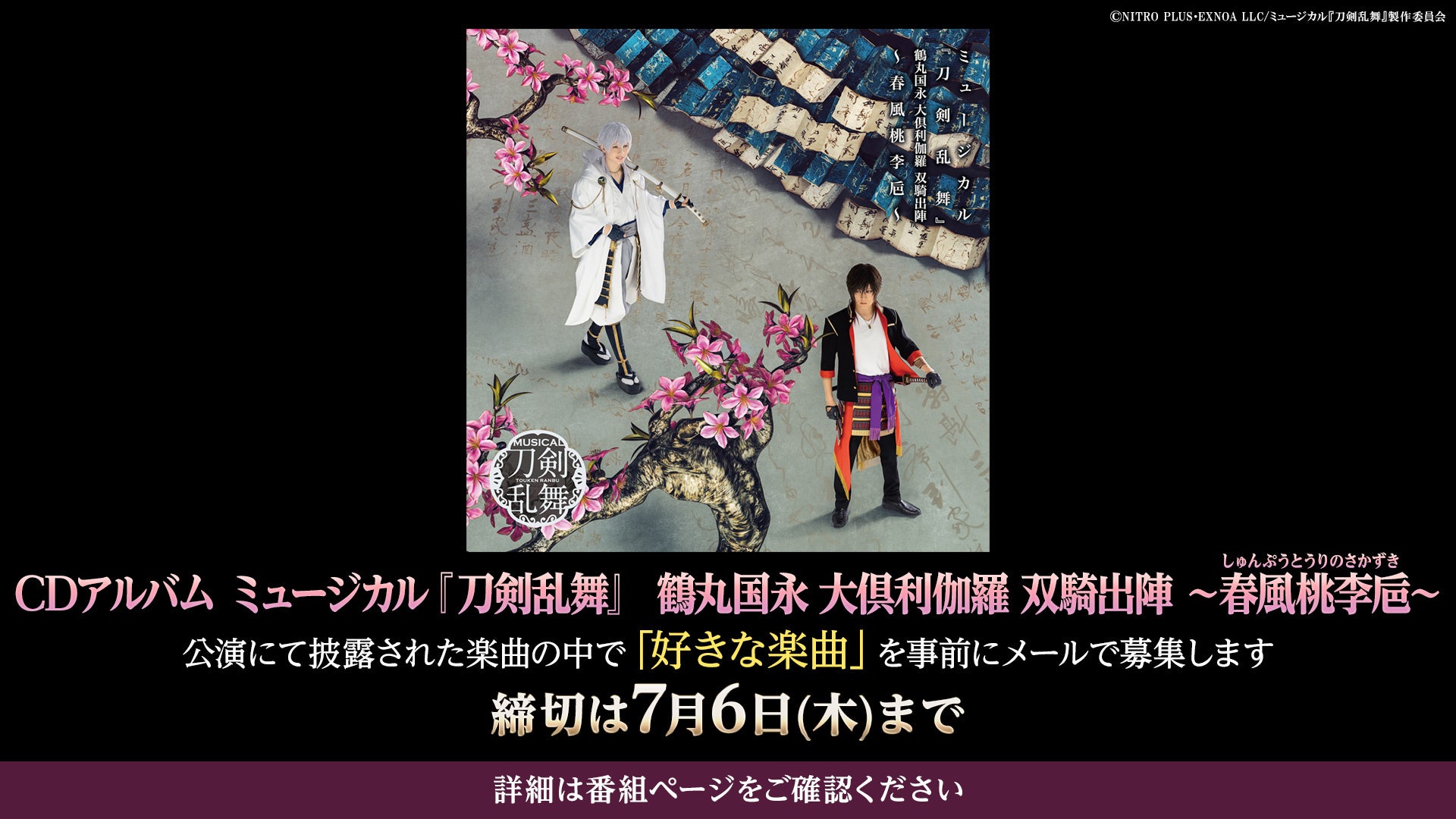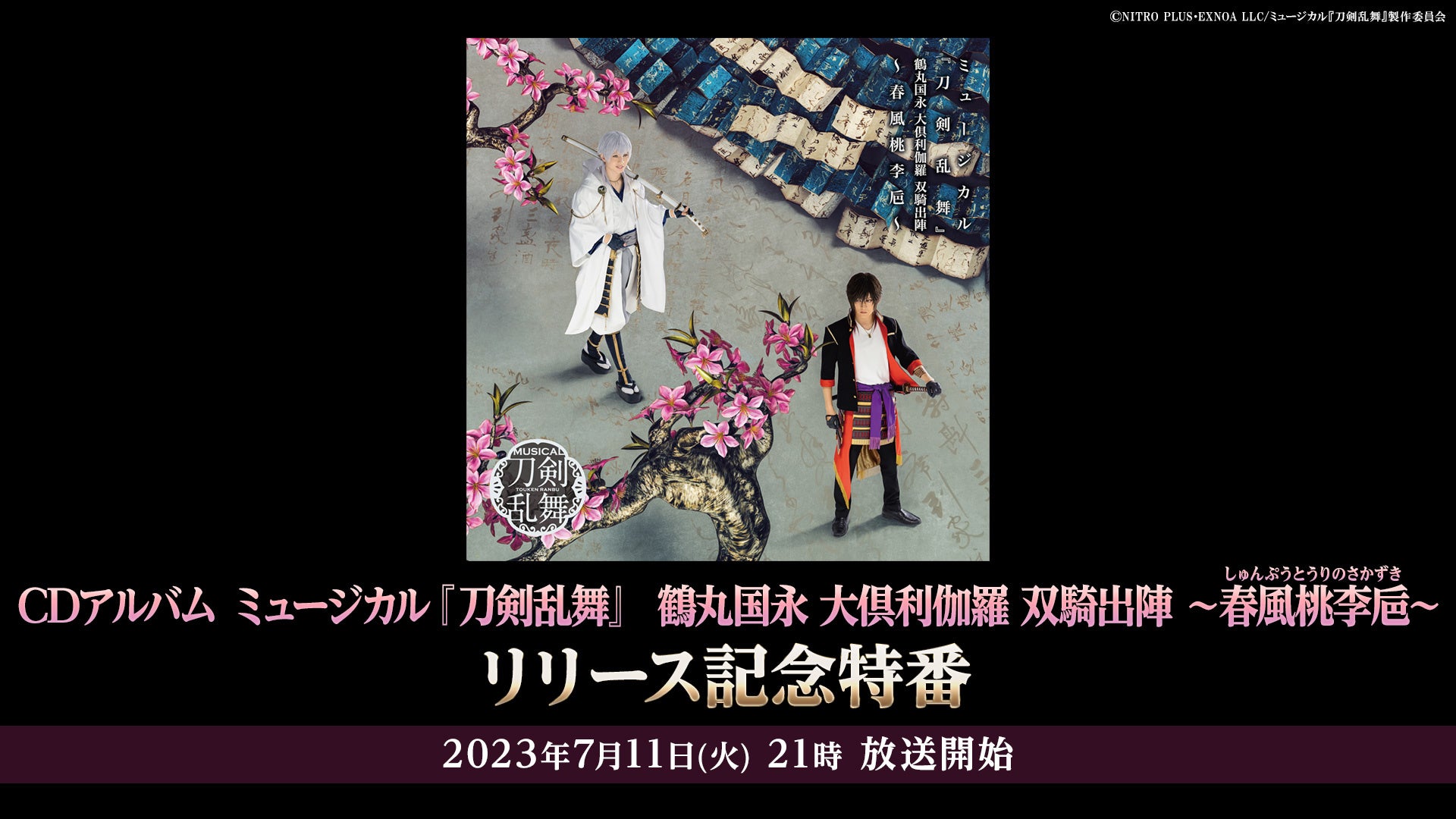 2023年7月12日(水)発売「CDアルバム ミュージカル『刀剣乱舞』 鶴丸国永 大倶利伽羅 双騎出陣 ~春風桃李巵~」のリリースを記念した特番が7月11日(火)21時より、ニコニコで生放送される。