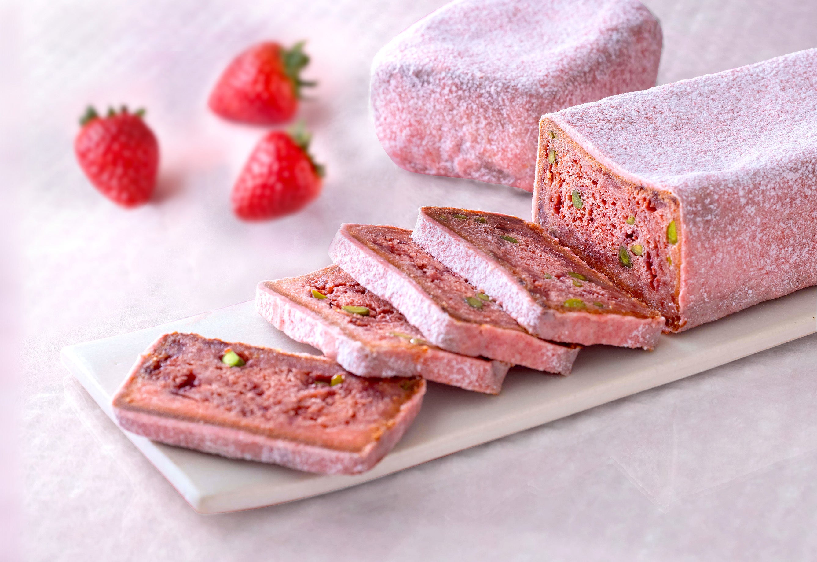 クリスマスに大人気のシュトーレンの技法を用い創り上げた「プランタン ~苺のお菓子~」は、フリーズドライの苺と苺味のチョコレートを使用し、アクセントに鮮やかな緑のピスタチオを散りばめています。