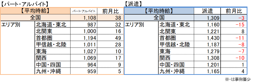 | 【パート・アルバイト】全国・全職種平均時給は1,108円。前月比+38円。前年同月比+62円。 【派遣】全国・全職種平均時給は1,309円。前月比-3円。前年同月比-43円。 【傾向】パート・アルバイトの平均時給は、全国・全職種平均よりも時給相場の高い「家事・保育・習い事」カテゴリの求人が前月比47%増加したことと、その中に高時給案件が多く含まれていたことを受け、前月に比べ大きく増加した。この影響により、全エリアで平均時給が前月を上回った。派遣の平均時給は、2021年6月以降、横ばいの傾向が続いている。 |