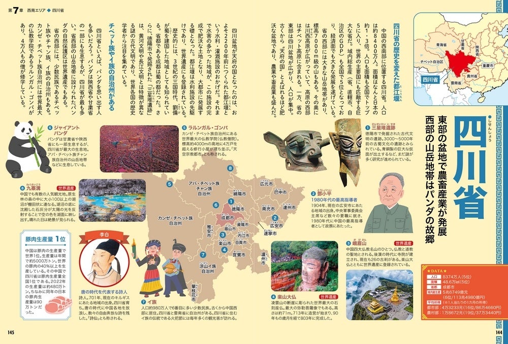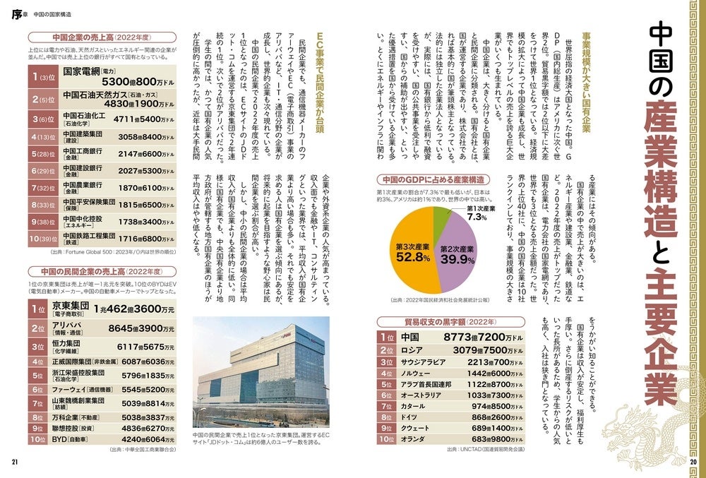 || 『中国』=巨大な中国をスッと理解できるよう序章を設け、国全体を概観したのち、国を構成する各行政区の「地理」「歴史」「主要都市」「民族構成」「言語」「面積」「人口」「生活レベル(平均収入)」「観光名所」「主要産業」「料理」「野生動物」「出身著名人」等の情報をを定評ある地図、イラスト、写真、テキストで紹介しました。中国共産党の一党支配や言論統制、民衆弾圧などの政治的なニュースが多い中で、あまり注目されることのなかった中国国民の暮らしぶりや生活文化、各地域の特性にも着目しています。