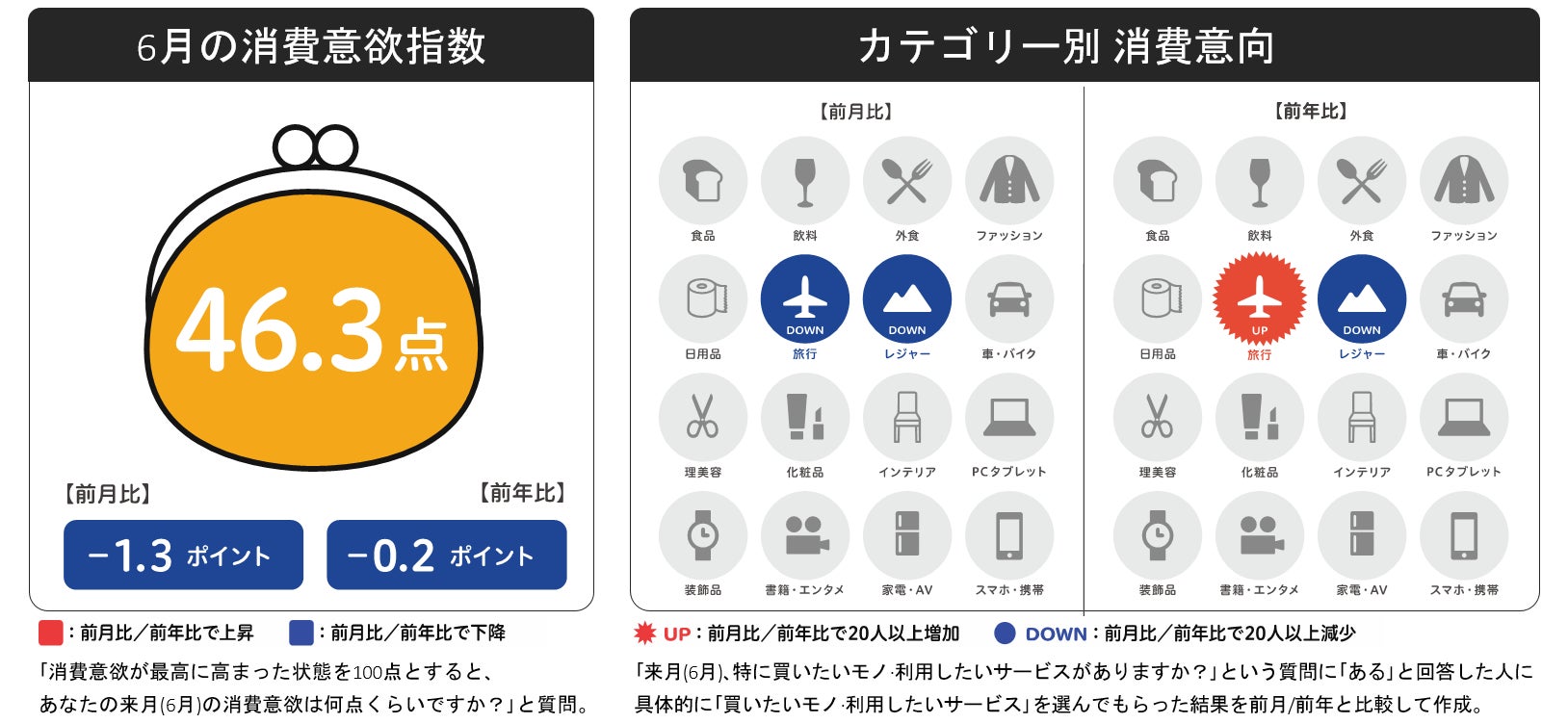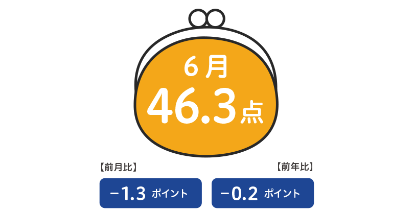 2023年6月の消費意欲指数は46.3点。前月比は-1.3ptの低下、前年比は-0.2ptの横ばいとなりました。