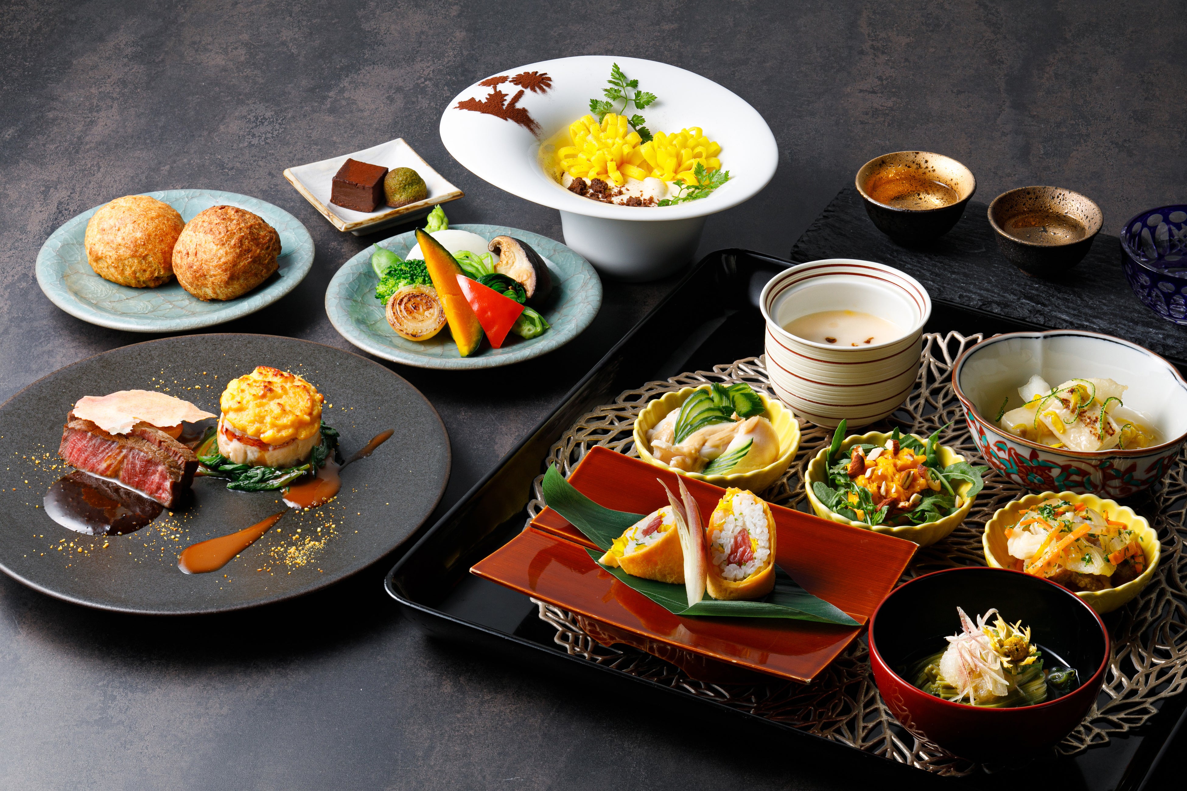 初めのお盆 おもてなしの七品(茶蕎麦 たんぽぽのお出しと共に ・カブラのプチポタージュとトリュフのフラン ・カボチャのポテトサラダ タンポポに見立てて ・タンポポで燻製した奥丹波鶏の胡麻和え ・白身魚の南蛮漬け ・たんぽぽをイメージした錦糸寿司・ふぐのフリット湯葉餡仕立て)主菜の一皿(黒毛和牛フィレ肉のロティとオマール海老とタンポポのテルミドール風)終演の一皿(パテシェ特製デザート“ダンデライオン”)パン 食後のお飲み物 ミニャルディーズ