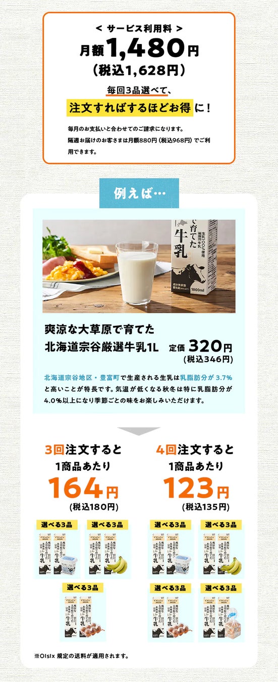 「牛乳とか飲み放題」サービスの利用料は月額1,480円(税込1,628円)、隔週お届けの場合は月額880円(税込968円)で、1リットルの牛乳を毎週3本お選びいただく場合、1本あたり135円(税込)となります。