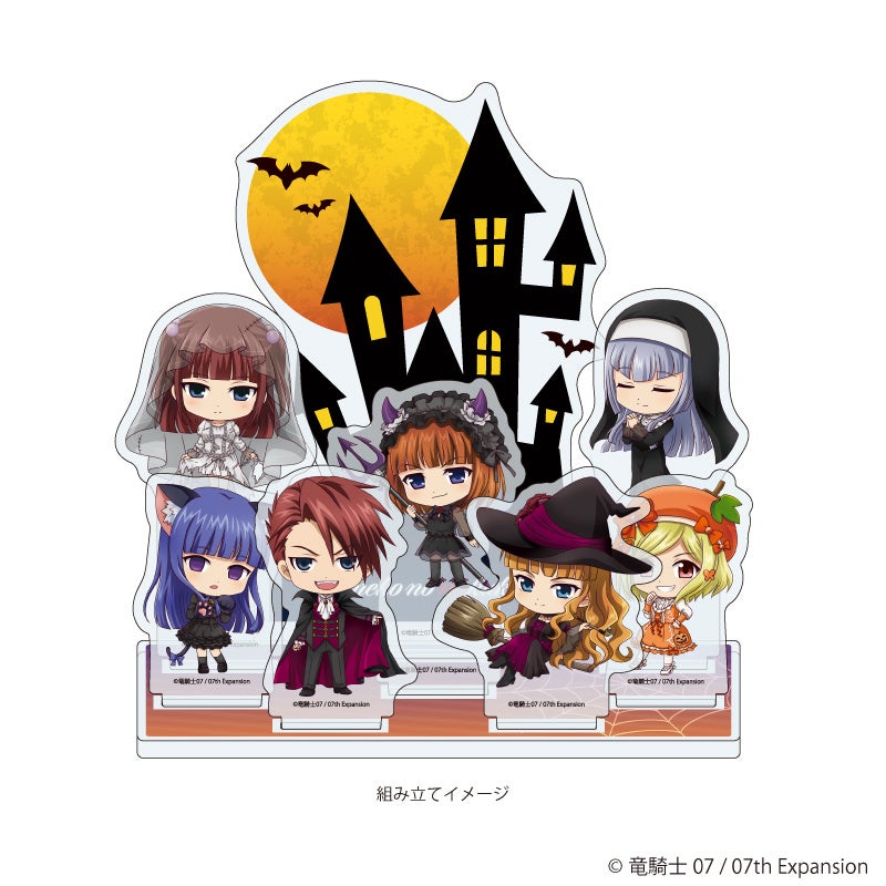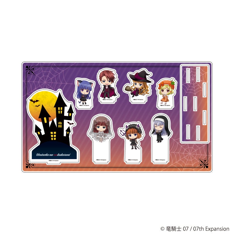 プレミアム アクリルジオラマプレートには、ハロウィン衣装を着た右代宮戦人やベアトリーチェたちのミニキャライラストを使用。
