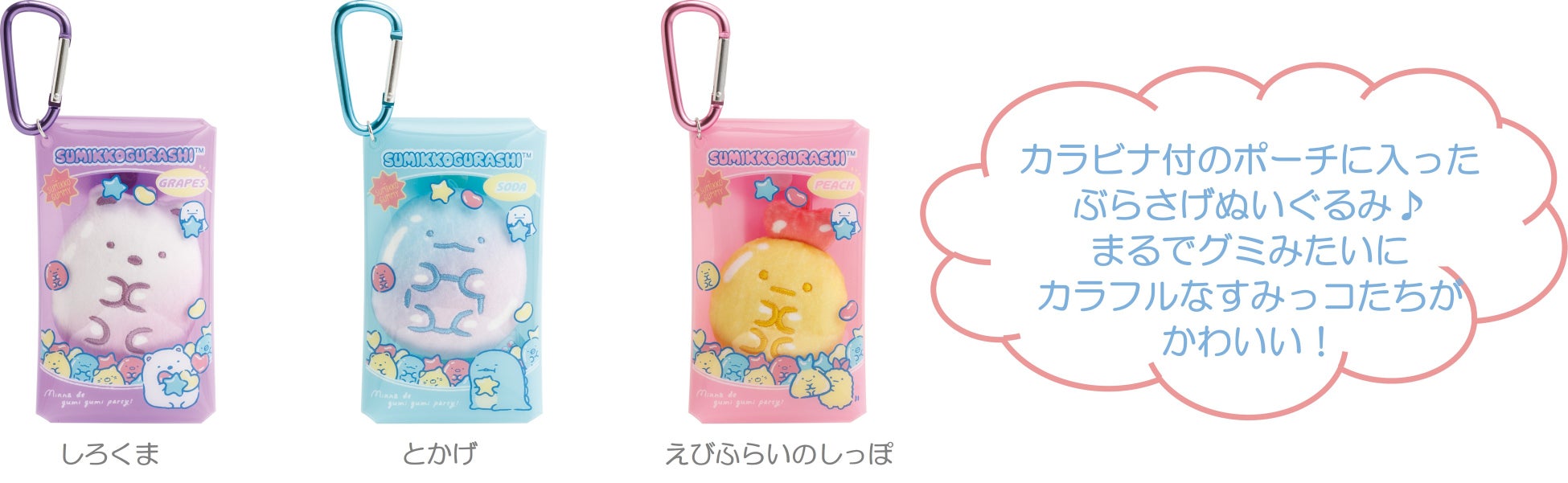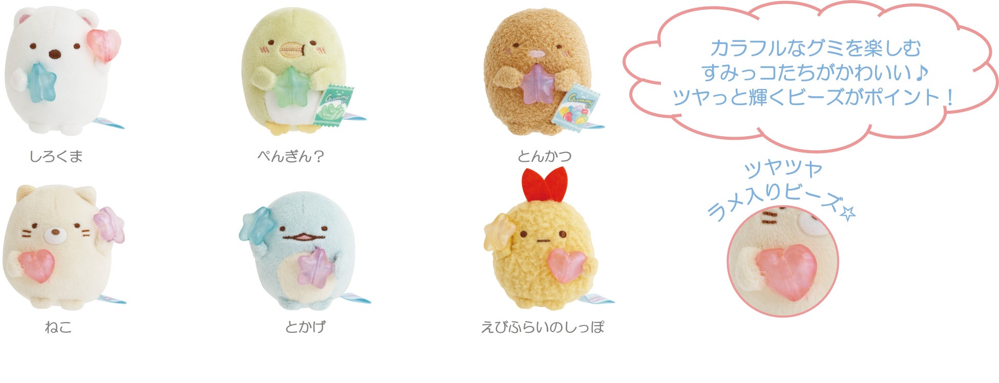 ぺんぎん?がたぴおかに似たグミを買ってきたことをきっかけに、グミをテーマにしたカラフルで楽しい新シリーズです。グミのような質感が楽しめるビーズストラップやヘアクリップ、消しゴムのほか、お菓子をモチーフにしたチャームやペンポーチなど、バラエティ豊かなアイテムが登場。さらに、すみっコたちがグミを手にした“てのりぬいるぐみ”や、グミのようになったすみっコたちをお菓子パッケージ風ポーチに詰めた“ぶらさげぬいぐるみ”など、見た目も楽しいアイテムが多数ラインナップします。トレンドの“グミモチーフ”をテーマに、見て・さわって楽しい新シリーズです。