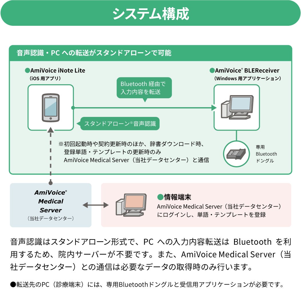 「AmiVoice iNote Lite」は、iOSデバイスを活用し、医療現場における記録作成を支援するサービスです。医療向けAI音声認識ワークシェアリングサービス「AmiVoice iNote」の一部の機能を包含し、よりコンパクトなシステム構成で、さらに導入しやすくなりました。