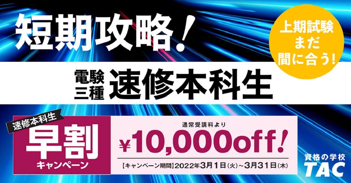 資格の学校TACでは、2022年度上期合格目標「電験三種 速修本科生」を新規開講、2022年3月1日(火)より申込受付を開始しました。通常受講料より10,000円OFFとなる早割キャンペーンも実施中です。