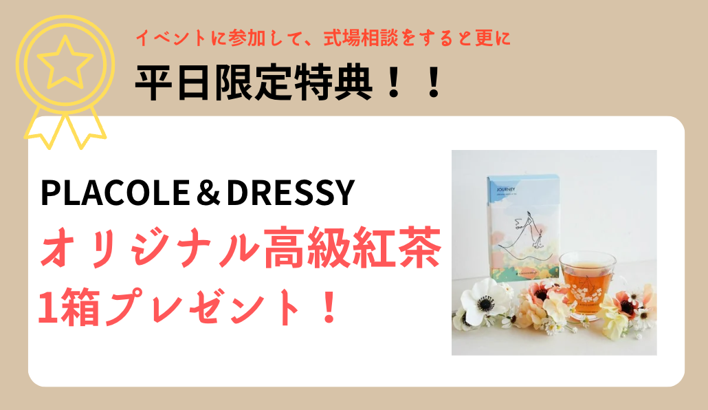平日開催日申し込みで限定特典『PLACOLE&DRESSYオリジナル高級紅茶』プレゼント中!