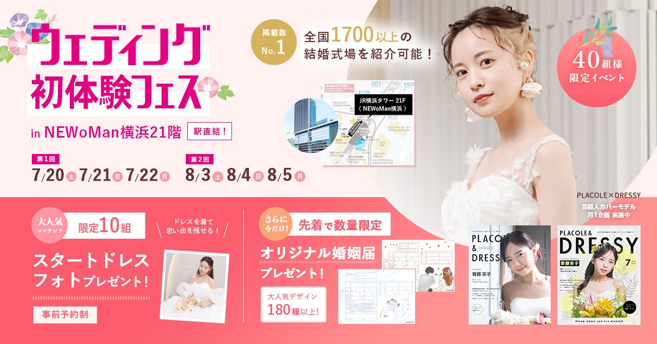 横浜駅直結、JR横浜タワーの21階、PLACOLE&DRESSY(プラコレ&ドレシー)の“体験型”花嫁相談カウンター【DRESSY ROOM】でセルフフォト「PICmii」無料体験など豪華特典付き!ウェディング初体験フェス in 横浜を開催いたします。安心のアクセス、商業施設NEWoMan横浜に直結ということもあり、お立ち寄りいただきやすい場所となっております。8/3(土)〜8/5(月)の3日間限定で40組様無料ご招待での限定開催となっております。このフェスでは「あなたに合った内容」で様々なコンテンツを用意し、結婚式準備をサポートいたします。