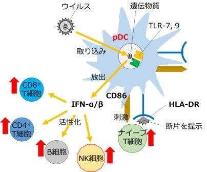 pDCは免疫細胞の一種で、血液中にごく僅かに存在します。pDCは病原体センサーであるToll様受容体(TLR)-7、9を持ち、取り込んだウイルス由来の遺伝物質を認識して、I型インターフェロン(IFN-α/β)という免疫物質を多量に産生します。このIFN-α/βがNK細胞、T細胞、B細胞などの免疫細胞を活性化します。また、活性化したpDCは細胞表面にHLA-DRやCD86という分子の発現を上昇させ、ナイーブT細胞を活性化します。これらの働きにより、活性化したpDCは自然免疫系、獲得免疫系の幅広い免疫細胞を活性化します(下記イメージ図)。