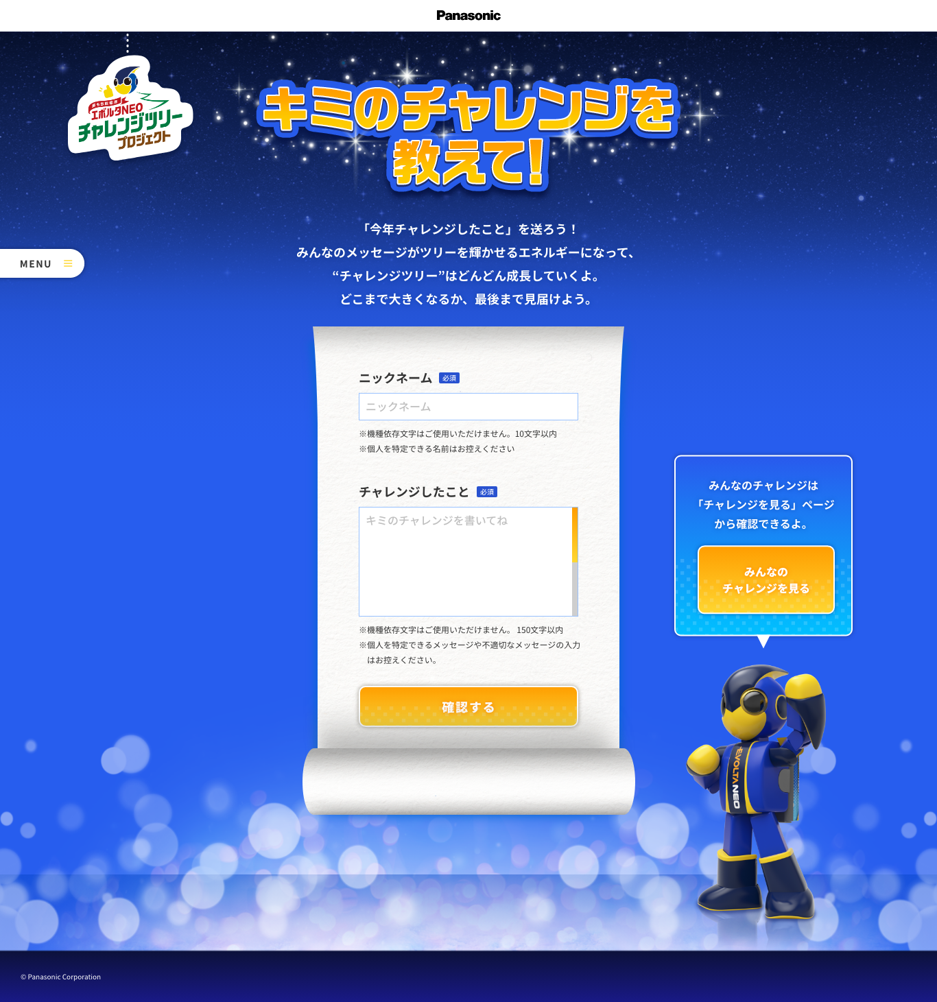 パナソニック株式会社は、乾電池エボルタNEOの長もち実証として行った高さ約6メートルの<エボルタNEOチャレンジツリー>の1ヶ月間連続点灯に成功しました(※乾電池エボルタNEO(単1形)500本を動力にLED電飾10,000個を33日間点灯)。さらにみんなの<一歩踏み出せたこと=チャレンジ>を募集し、一緒に創り上げる「エボルタNEOチャレンジツリープロジェクト」において、期間中には19,372件もの「今年チャレンジしたこと」が投稿されました。