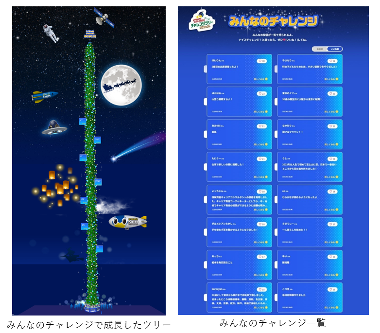スペシャルWEBコンテンツに登場するチャレンジツリーは、参加者からの「チャレンジしたこと」の投稿をエネルギーとして、だんだん育っていきます。高さにあわせて背景にはさまざまなアイテムが登場。チャレンジツリーがどこまで大きくなるのかなど最後まで何度も楽しめるコンテンツです。
