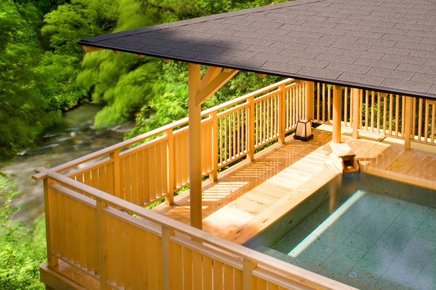 渓流を眺める温泉大浴場と露天風呂の入浴