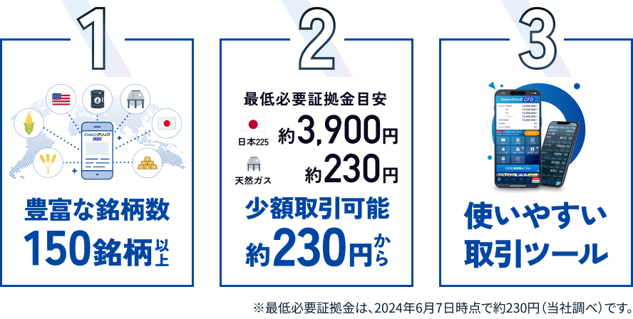 当社のCFDは、たった一つの口座で、金や原油、株価指数や外国株式など世界経済のポイントをおさえた幅広い銘柄に少額から日本円で投資することができます。CFDの主要銘柄(※2)の最小取引数量は0.1枚で、0.1枚のミニCFDなら最低必要証拠金も従来の10分の1となり、さらに少額からのお取引が可能です。取引ツールは、初心者から上級者までストレスフリーにお取引をしていただけるよう、お客様のお取引スタイルに合わせたスマホアプリや高機能PCツールをご用意しています。