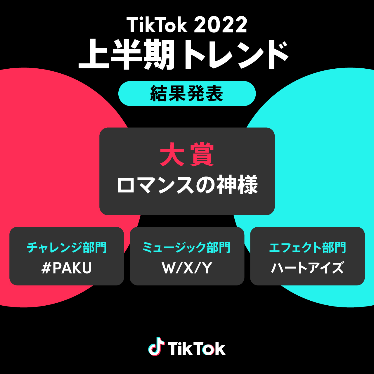 「TikTok2022上半期トレンド」大賞は「ロマンスの神様」に決定!チャレンジ部門賞は「#PAKU」、ミュージック部門賞は「W/X/Y」、エフェクト部門賞は「ハートアイズ」に!