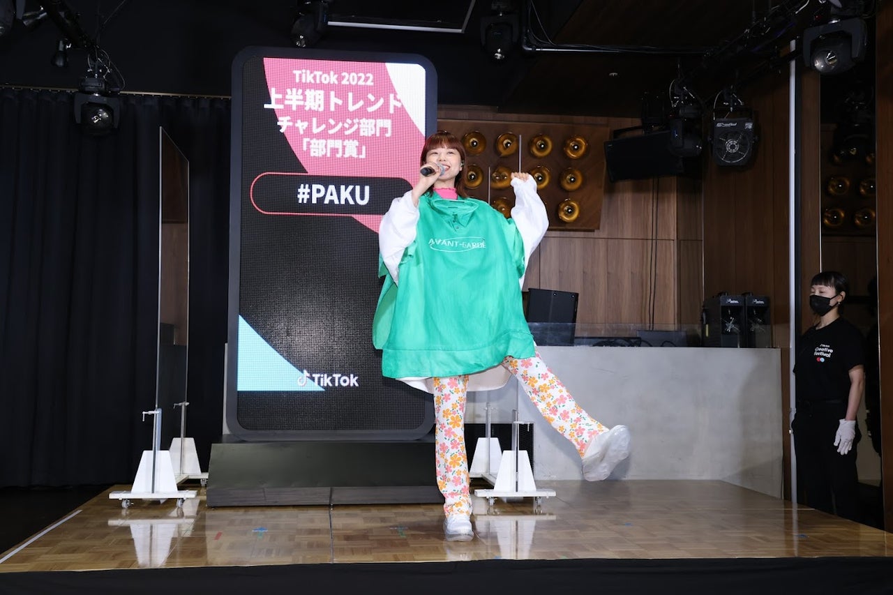 「TikTok2022上半期トレンド」チャレンジ部門賞は「#PAKU」に決定。「#PAKU」はasmiの楽曲で、作詞・作曲は「なにやってもうまくいかない」で知られるmeiyoが担当しました。可愛い振り付け投稿が人気となり、投稿数はチャレンジ部門ノミネート10選の中で最も高い結果となるなど、TikTokに大きな影響を及ぼしたため受賞となりました。結果発表時には、asmiがPAKUの生歌唱を披露し、盾を受け取りました。