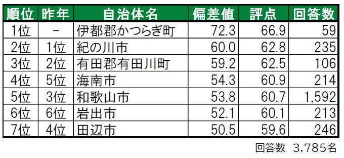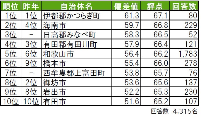1位は伊都郡かつらぎ町で、「住み続けたい街」「街に誇りがある」「街に愛着がある」でも1位、「住みここち」は3位と各ランキングで高評価を得ています。2位は海南市で、「住み続けたい街」「街に誇りがある」の両ランキングでは4位となっています。3位は日高郡みなべ町で、昨年は累計回答数が50名未満だったためランキング集計対象外だった町です。