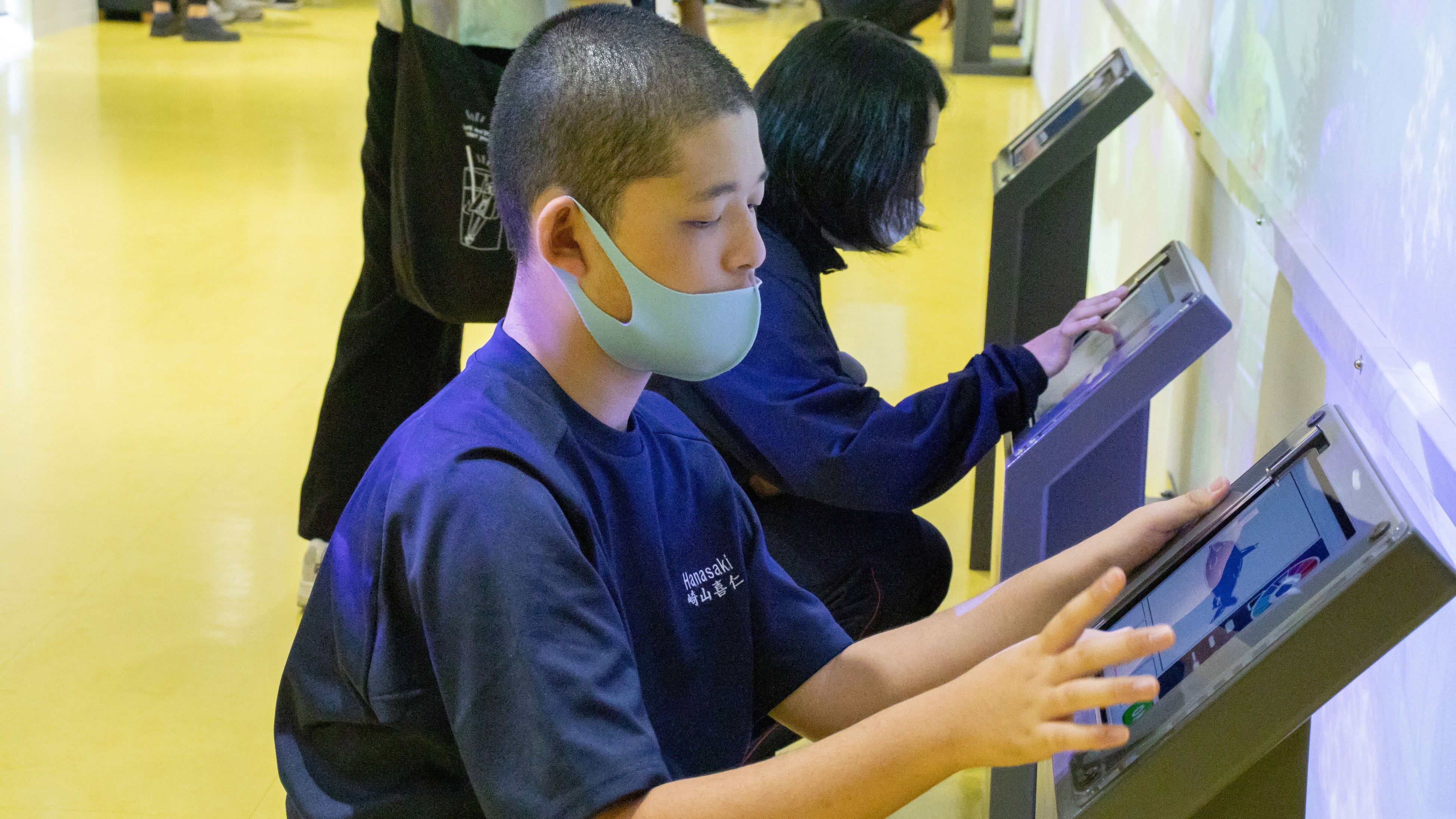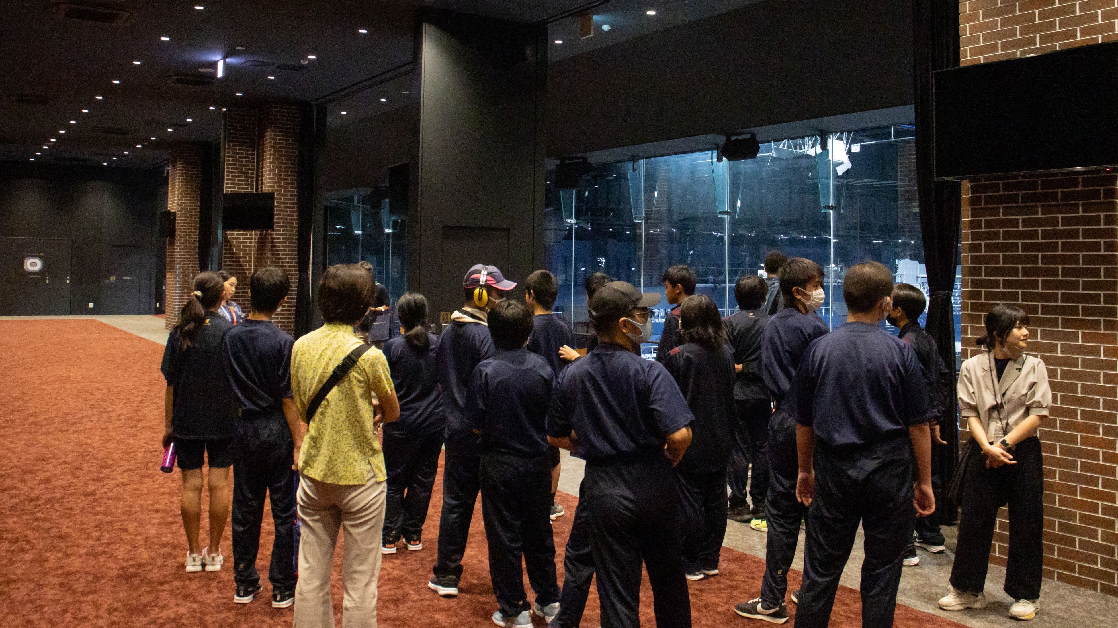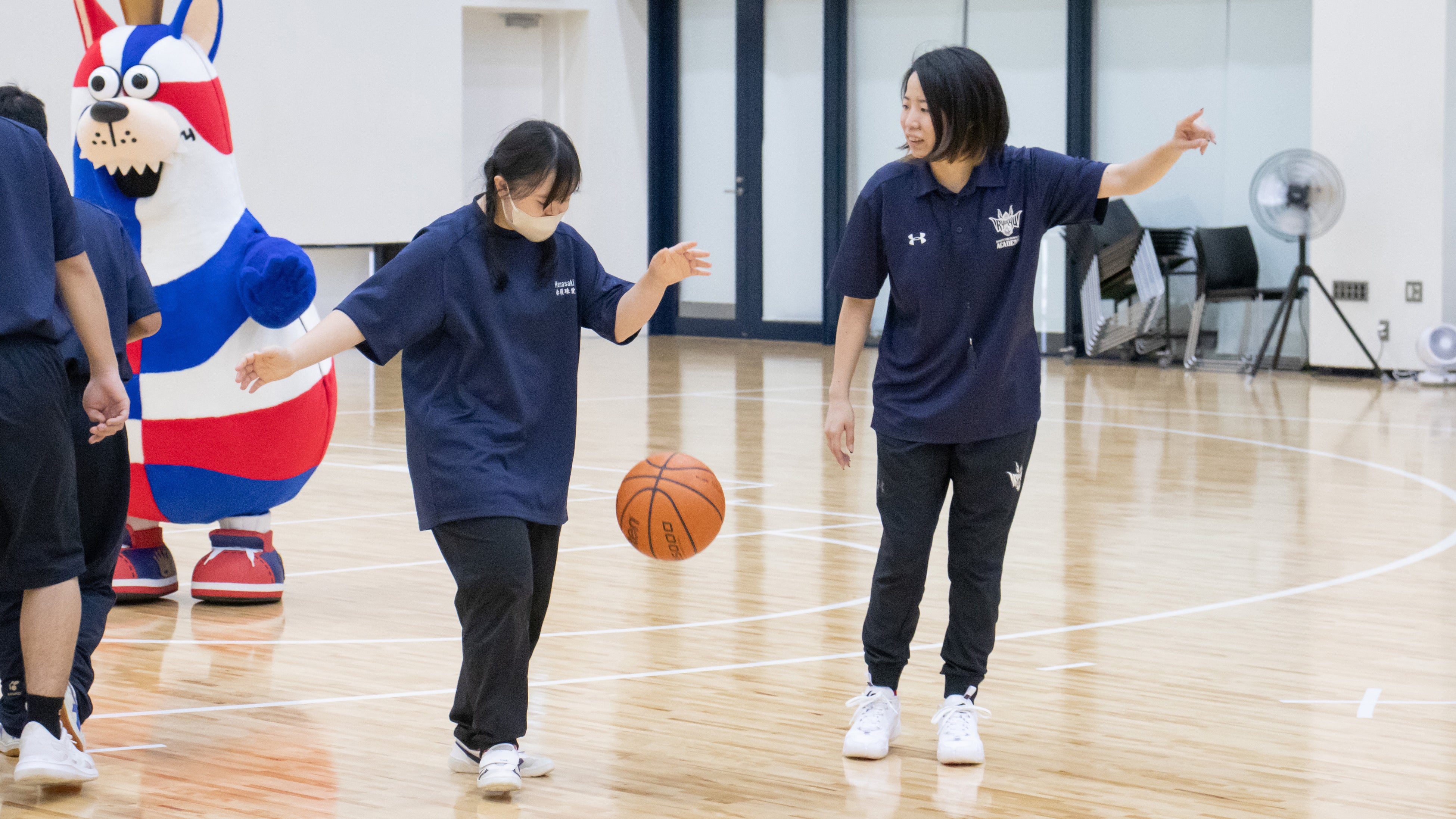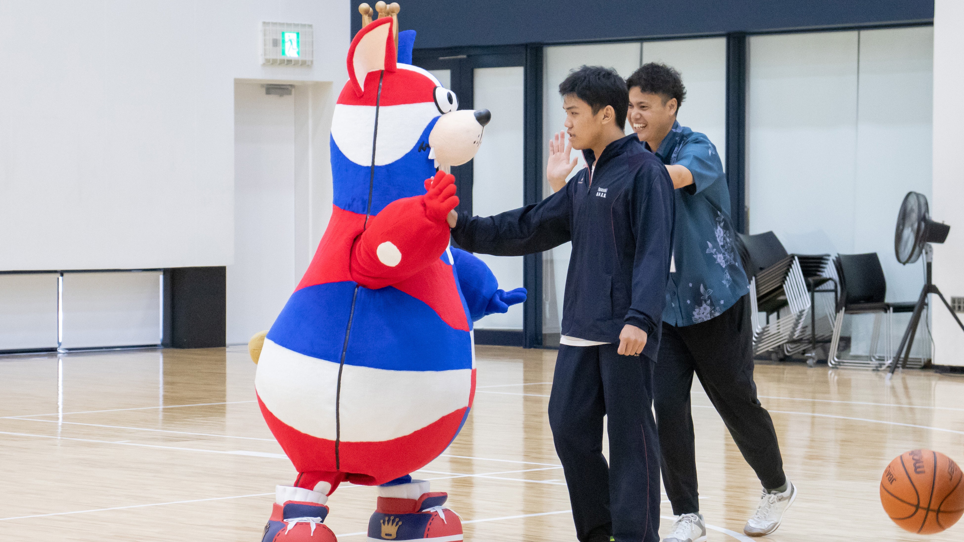 沖縄アリーナ見学では、最上階5階のパノラマラウンジから見るフロアや、スイートルーム見学、2階のキッズコンテンツ体験などを行いました。バスケ交流会では、チームの一体感を高めるためハドルを組んだり、グループでドリブルシュートを行い、ゴーディーも応援に駆けつけ生徒たちと交流し、体を動かすことやバスケットボールの楽しさを体験いただきました。