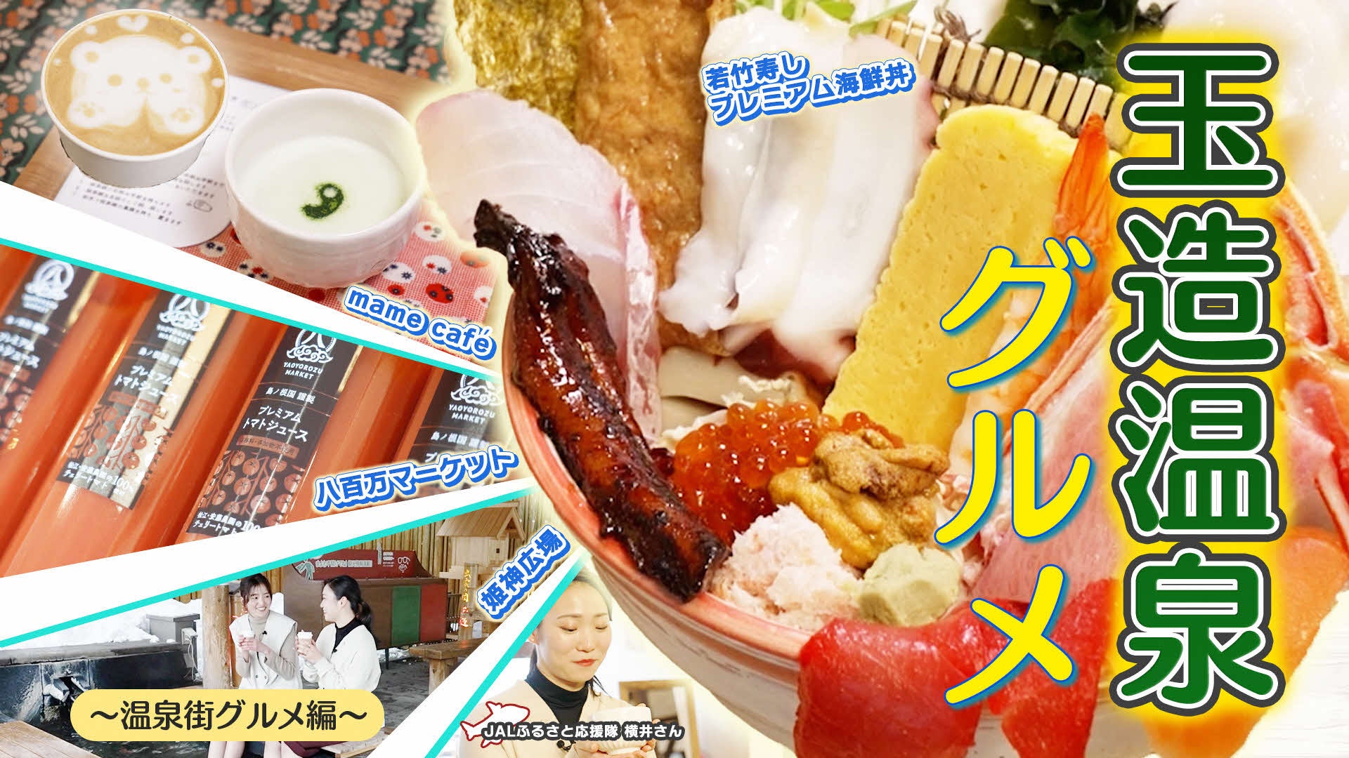 旅行と言えばグルメも重要な要素ですよね。この動画では、玉造温泉ならではの美味しい食べ物を紹介すると共に、美肌に関連するポイントも取り上げています。撮影には、「若竹寿し」にご協力いただきました。器からネタがはみ出るほど豪華な「プレミアム海鮮丼」を目当てに観光客の行列ができるほどの人気店です。