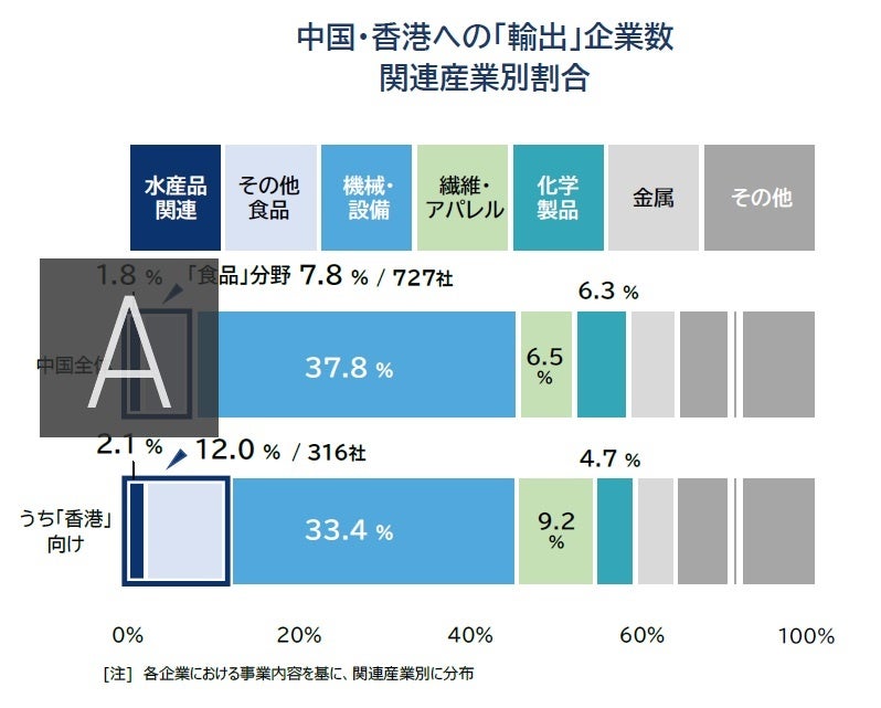 日本産食品への高い知名度や購買力などを背景に食品の輸出先として重視される香港では、食品産業の占める割合が12.0%・316社と1割を超えた。このうち、水産品関連を主業とする企業は香港向け輸出企業全体の2.1%・56社と少ないものの、販売額のうち香港向けが占める割合はいずれも大きかった。