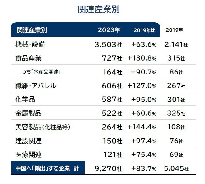 在中国の企業に製品やサービスなどを販売(提供)する、対中国への輸出を直接・間接的に行う日本企業を調査した結果、2023年8月現在で国内に9270社に上ることが分かった。2019年調査時点で判明した5045社に比べ、4225社・83.7%増加した。このうち、香港特別行政区(以下、香港)向けに輸出を行う企業は2639社判明し、19年から1183社・81.3%増加した。