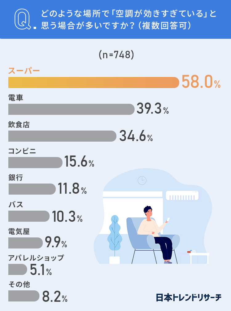 特にどのような場所で感じることが多いかの質問では、「スーパー」が58%ともっとも多く、次いで「電車」「飲食店」で空調が効きすぎていると感じたことがある方が多いようです。