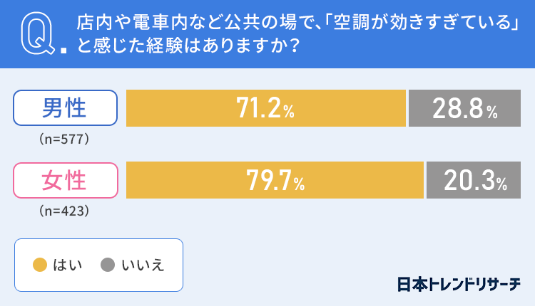 まずは全国の男女1000人に、店内や電車内など公共の場で「空調が効きすぎている」と感じた経験はあるか聞きました。
