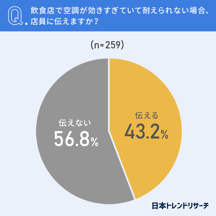 56.7%と半数以上の方が、飲食店で空調が効きすぎていて耐えられなくても「店員には伝えない」と回答しました。