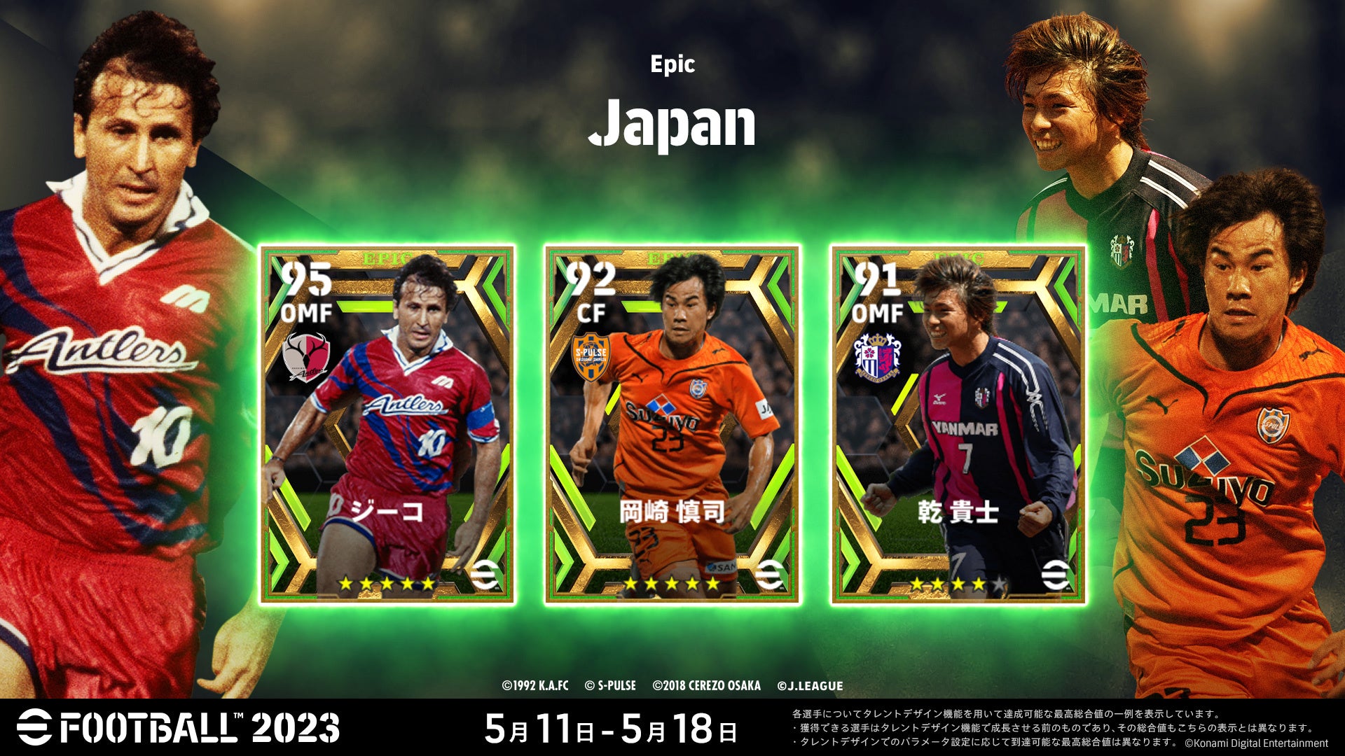 そして『eFootball™ 2023』では、「Epic Japan」にジーコ選手をはじめ、岡崎慎司選手、乾貴士選手が登場!