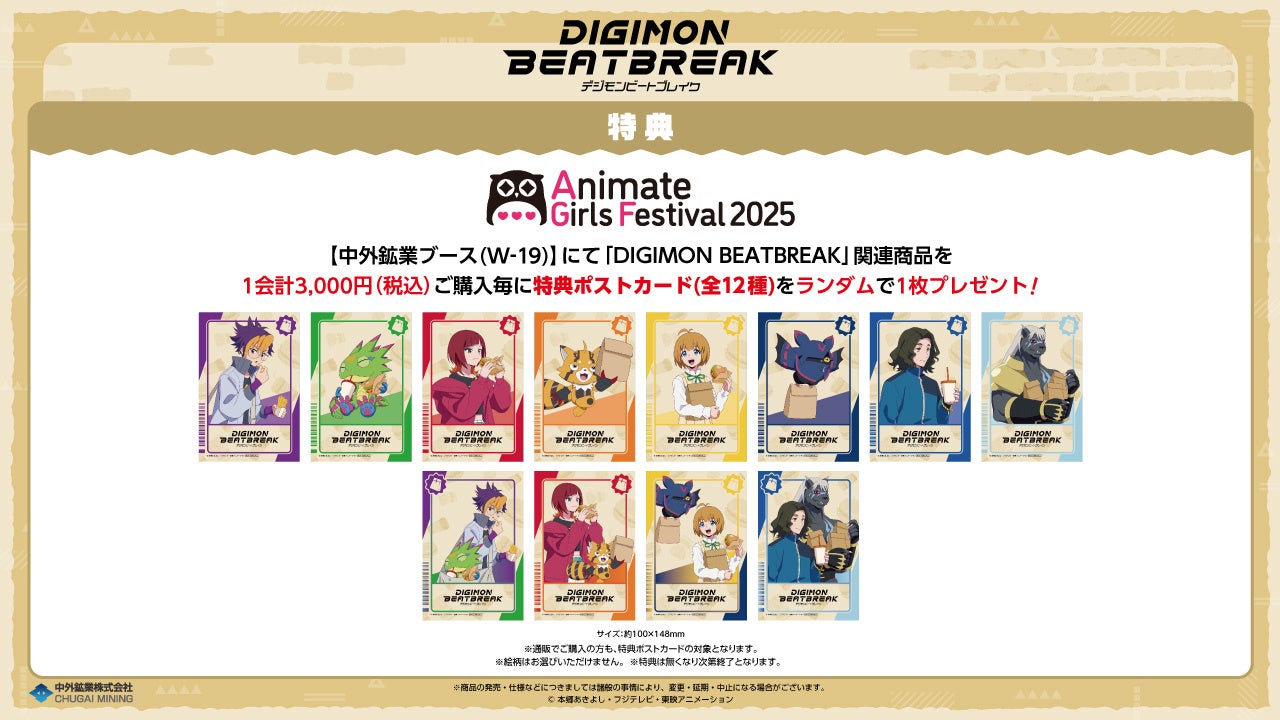 中外鉱業ブースにて『DIGIMON BEATBREAK』AGF関連商品を1会計3,000円(税込)ご購入毎に、特典ポストカード(全12種)をランダムで1枚お渡しいたします!