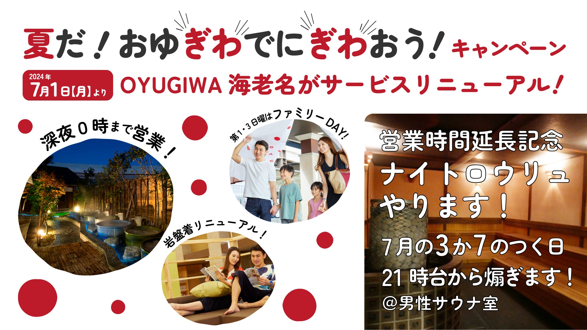 OYUGIWA海老名のサービスリニューアルを記念し、サービスリニューアルと同日から「夏だ!おゆぎわでにぎわおう!キャンペーン」を開催し、7月中の3か7のつく日は21時台から煽ぐアウフグース「ナイトロウリュ」や、回数券購入でOYUGIWAご入館招待券が当たるガラポン「さらにガラポンでにぎわおう!」などを実施いたします。