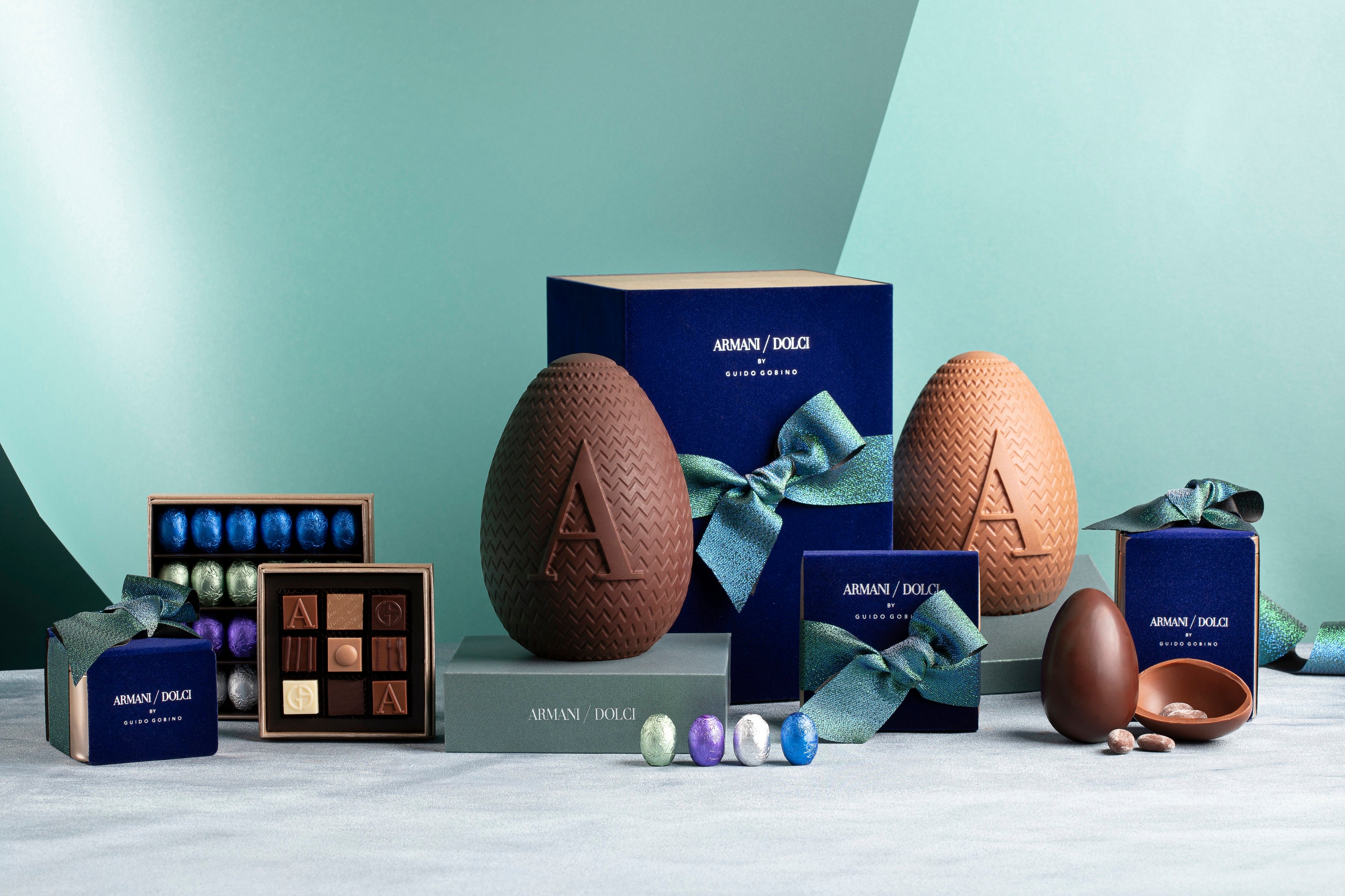 ミニエッグは、左から、ホワイトチョコレートベースのペア&シナモンとマンゴー&ジンジャー、ピーカンナッツとコーヒークランチ入りミルクチョコレート、バニラフィリング入りカカオ75%ダークチョコレートの4種。24個入りのボックスに加え、ティンボックス入りも展開します。さらに、アルマーニ / ドルチのシグネチャーである9個入りプラリネボックスも取り揃え、大切な方への贈り物としてはもちろん、ご自身へのご褒美にもふさわしい逸品です。