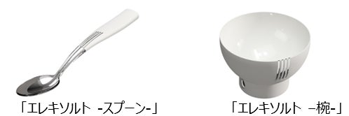 「エレキソルト」デバイスは、キリンと明治大学(学長 大六野耕作)総合数理学部先端メディアサイエンス学科宮下芳明研究室との共同研究で開発した、減塩食品の塩味を約1.5倍※2に増強させる独自の電流波形の技術を搭載した、スプーンとお椀型のデバイスです。