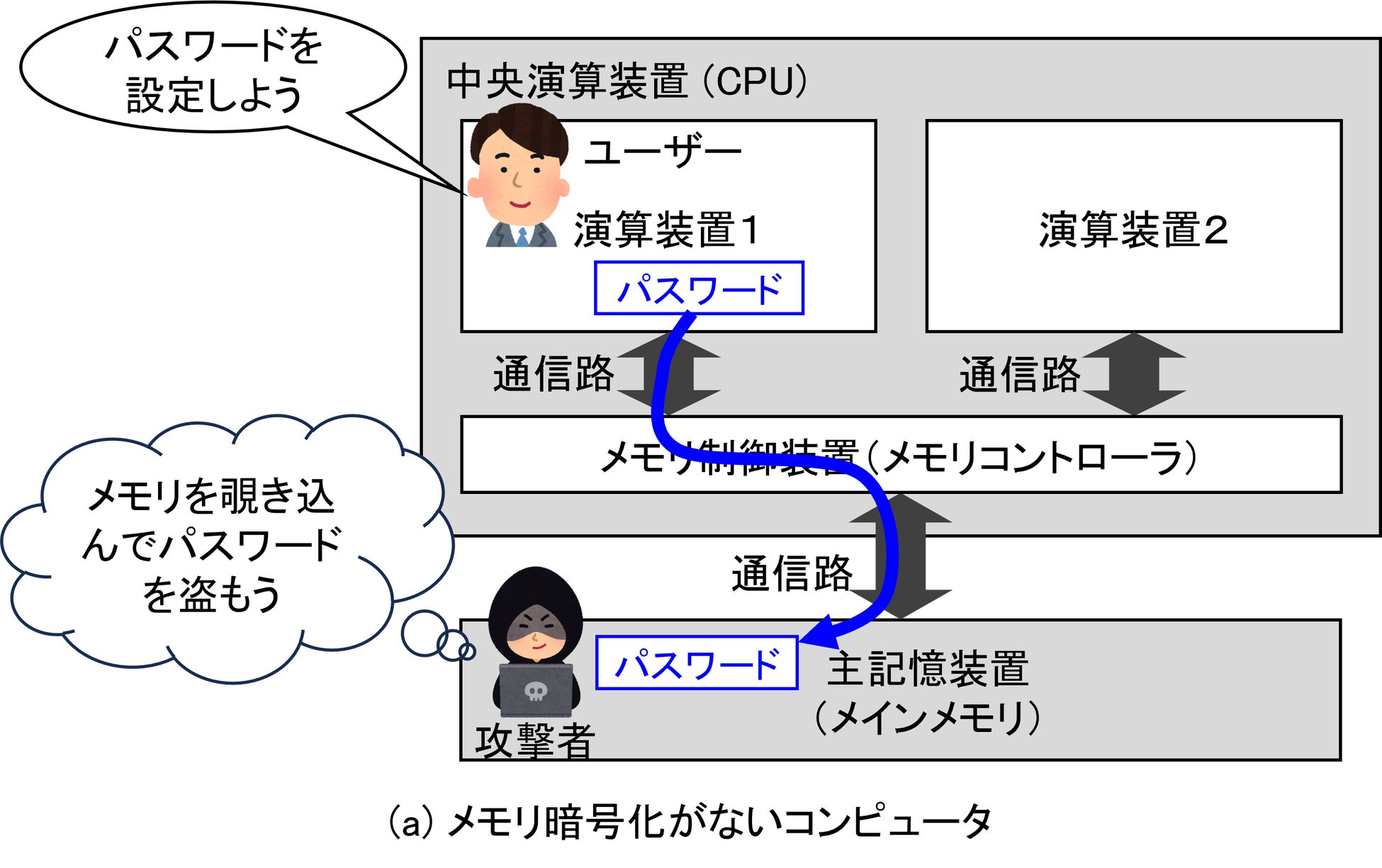 現在、個人情報や金融情報といった大切な情報がコンピュータ上で処理され保管されることが一般的となっています。現代のコンピュータのほとんどは、演算処理を行う中央演算装置(CPU)と、データを格納する主記憶装置(メインメモリまたはメモリ)が中心的な役割を担っており(図1)、コンピュータが実行中のプログラムコードや情報処理に必要なデータは通常一時的にメモリに格納されます。一方、メモリに格納されたデータ(メモリデータ)を、データの所有者以外が不正に盗み見る、不正に改ざんするなど攻撃の脅威が報告されています(図2)。例えば、メモリはCPUの外部に取り外し可能な形で接続されることが多いため、このメモリを取り外して解析する(別のコンピュータに接続し、秘密の情報を盗み見る)攻撃が知られています(注1)。近年では、クラウドサービスなどで遠隔のコンピュータ(計算機サーバ)を利用する機会が増えていますが、このようなクラウドサービスは多数の利用者が同じCPUやメモリを共有します。利用者に悪意ある攻撃者がいた場合、クラウドサービスにおける共有メモリを介した攻撃(共有されたメモリを介して秘密情報の盗聴や改ざん)が可能なことも報告されています(注2)。このような脅威に対抗するため、メモリデータの機密性と改ざん検知をいかに実現するかについて、暗号と情報セキュリティ分野およびコンピュータ設計分野において世界的に研究開発が進められています。