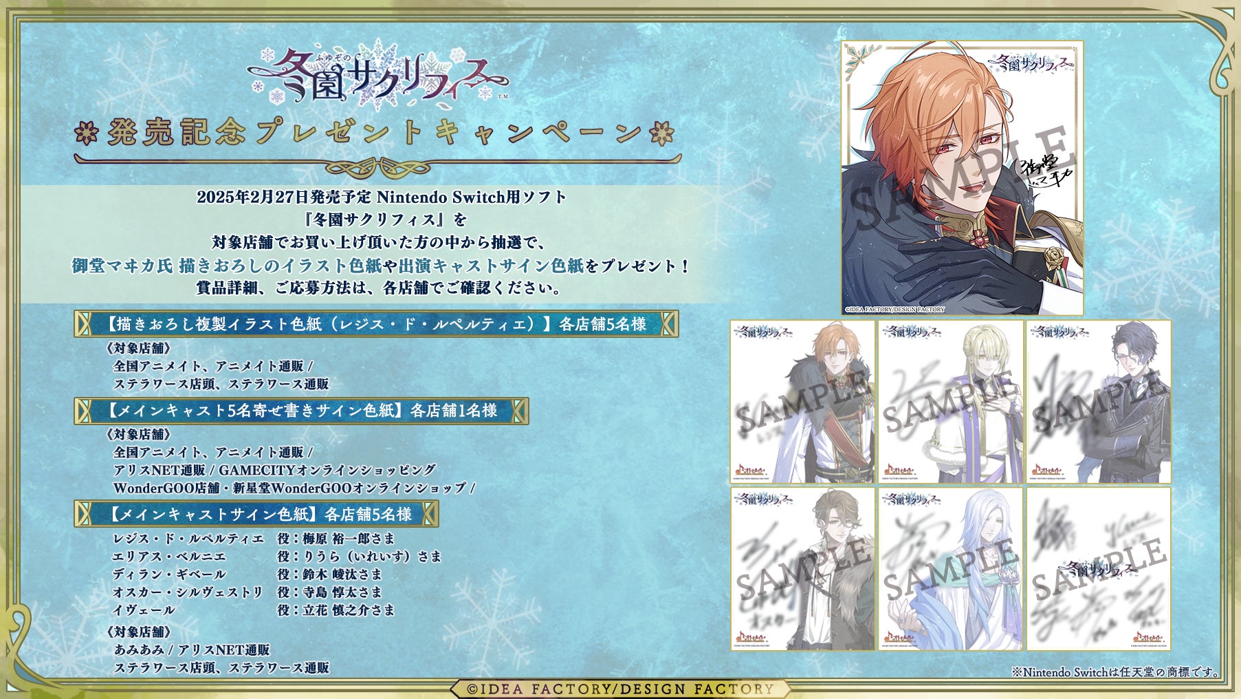 アイディアファクトリー株式会社(代表取締役社長:佐藤 嘉晃/所在地:東京都豊島区)の女性向けゲームブランド「オトメイト」は、Nintendo Switch™用ゲームソフト『冬園サクリフィス』の発売を記念した、プレゼントキャンペーンの実施を決定いたしました。