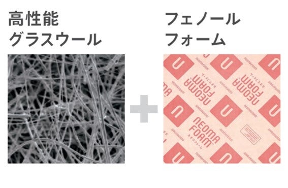 細かいガラス繊維が絡み合ってできる空間が熱を伝えにくくする高性能グラスウールと、薄くても高い断熱性能を発揮するフェノールフォーム、2種類の断熱材で断熱効果をアップしました。