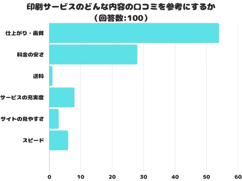 印刷サービスのどんな内容の口コミを参考にするかをアンケートにて調査したところ、1位は「仕上がり・画質」でした。