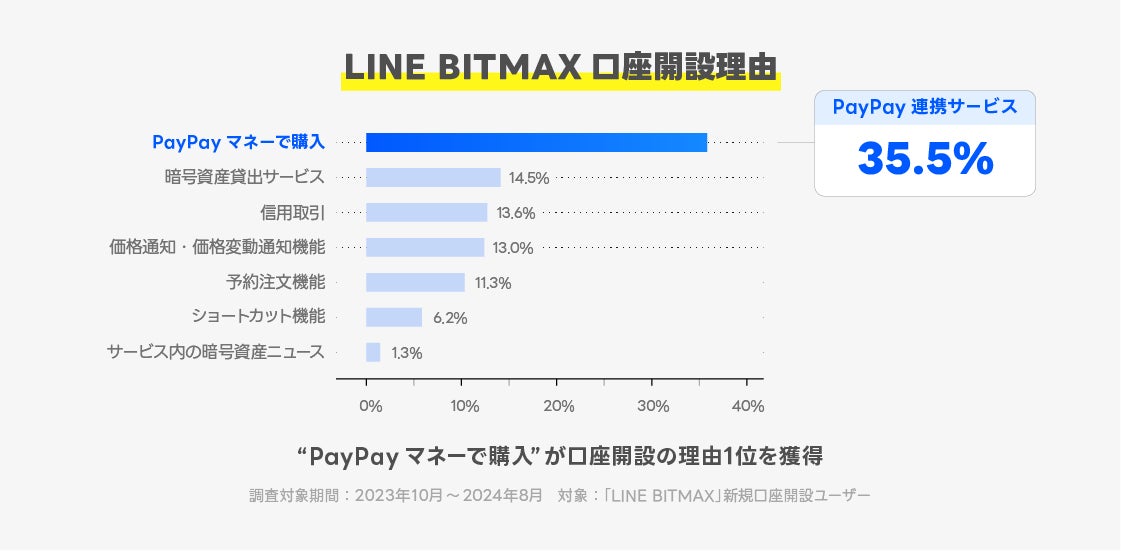 「LINE BITMAX」では、2023年7月に、PayPayマネーで暗号資産の購入やPayPayマネーへの出金ができる「PayPay連携サービス」を開始しました。※2 2023年10月〜2024年8月に「LINE BITMAX」新規口座開設ユーザーを対象に行ったアンケートでは、口座開設理由において「PayPayマネーで購入できるから」という回答が1位になるなど、サービス開始以降、「PayPay連携サービス」の利用を目的とした新規ユーザーが増加しています。
