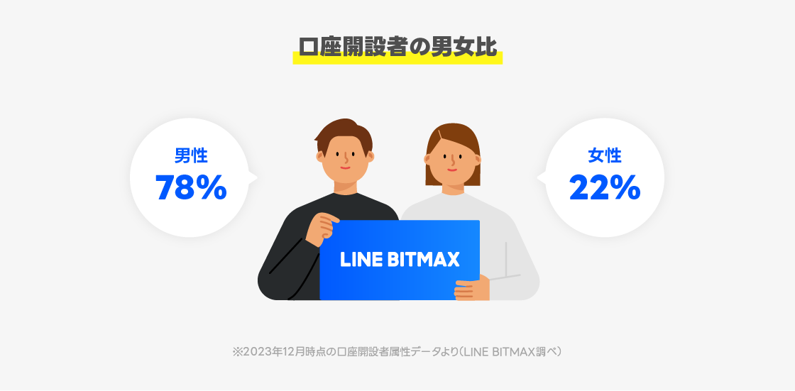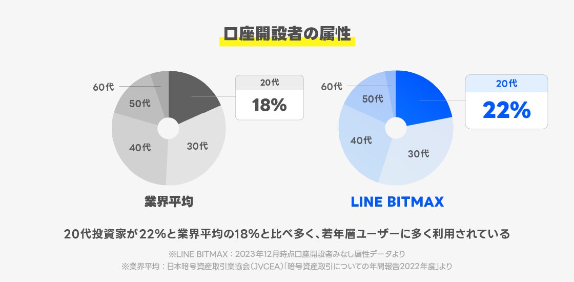 口座開設者の属性をみると、「LINE BITMAX」では業界平均と比べ20代投資家が22%と、多くの若年層ユーザーに利用されています。「LINE」から始められる手軽さや全暗号資産が1円から取引可能であるという点が支持されています。